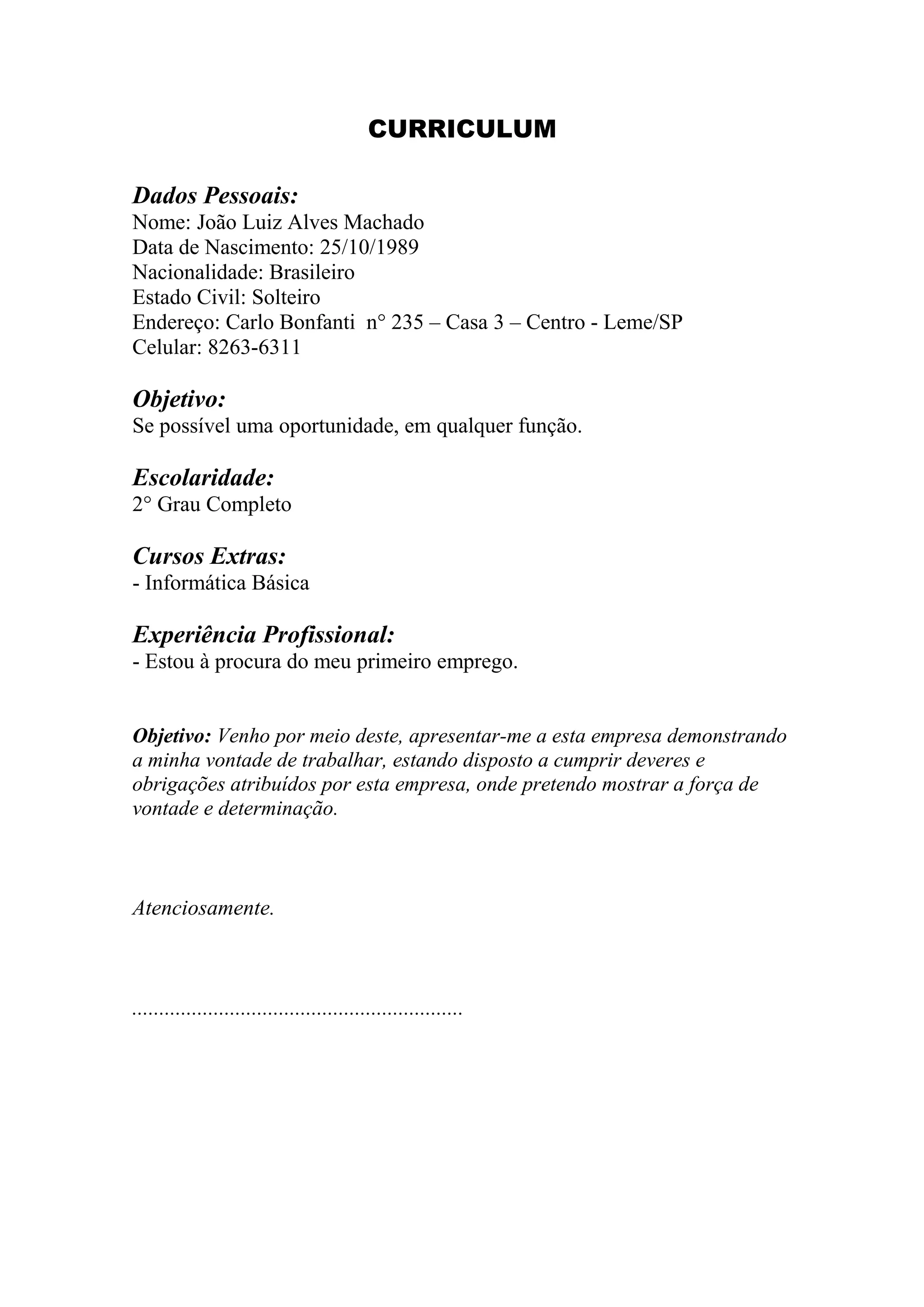 João Luiz Alves Machado, brasileiro e solteiro de 32 anos, está procurando sua primeira oportunidade de emprego em qualquer função. Ele tem o ensino médio completo e cursos de informática básica, e está disposto a cumprir os deveres atribuídos pela empresa.