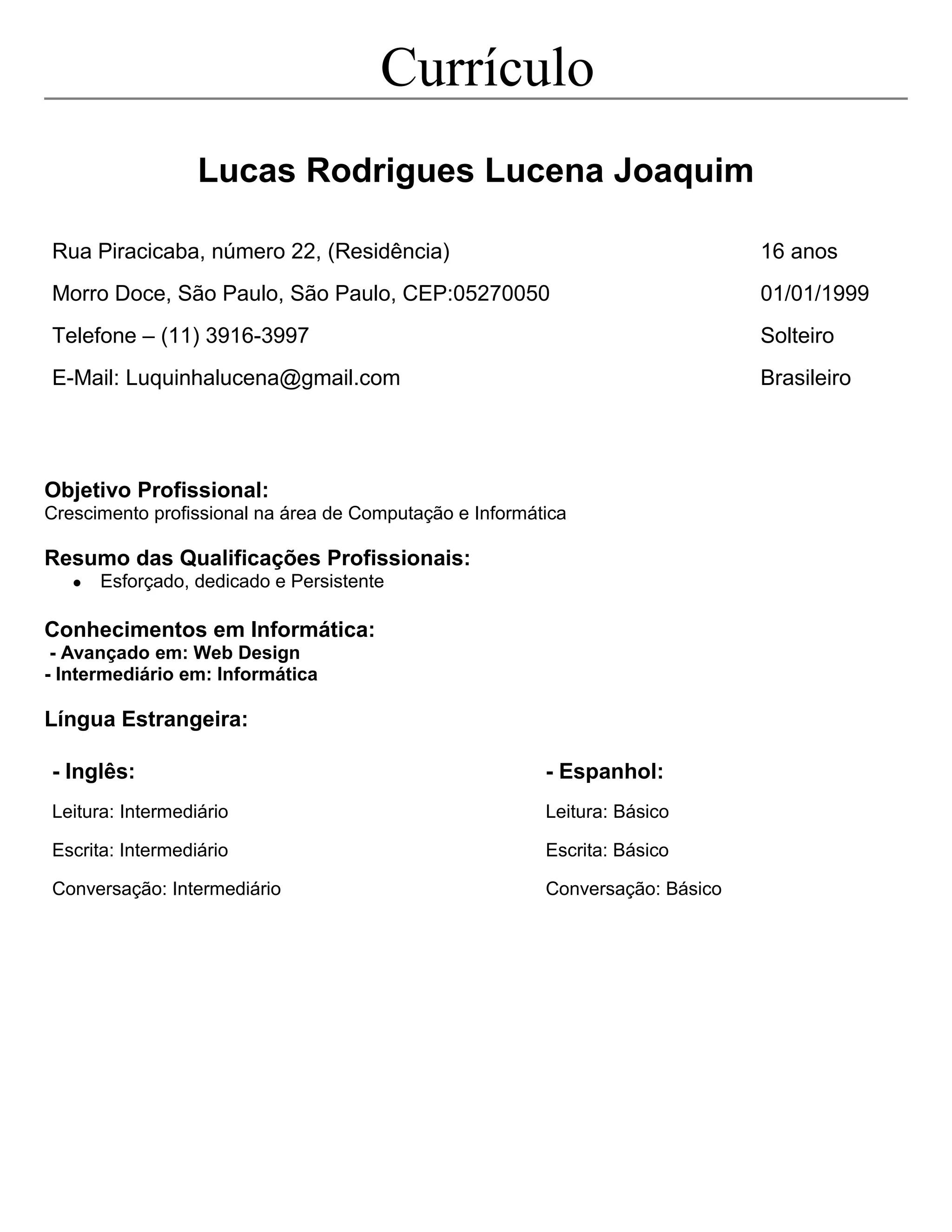 Lucas Rodrigues Lucena Joaquim, de 16 anos, morador de São Paulo, busca crescimento profissional na área de Computação e Informática, tendo conhecimentos avançados em Web Design e intermediários em Informática, além de níveis intermediário e básico de inglês e espanhol respectivamente.