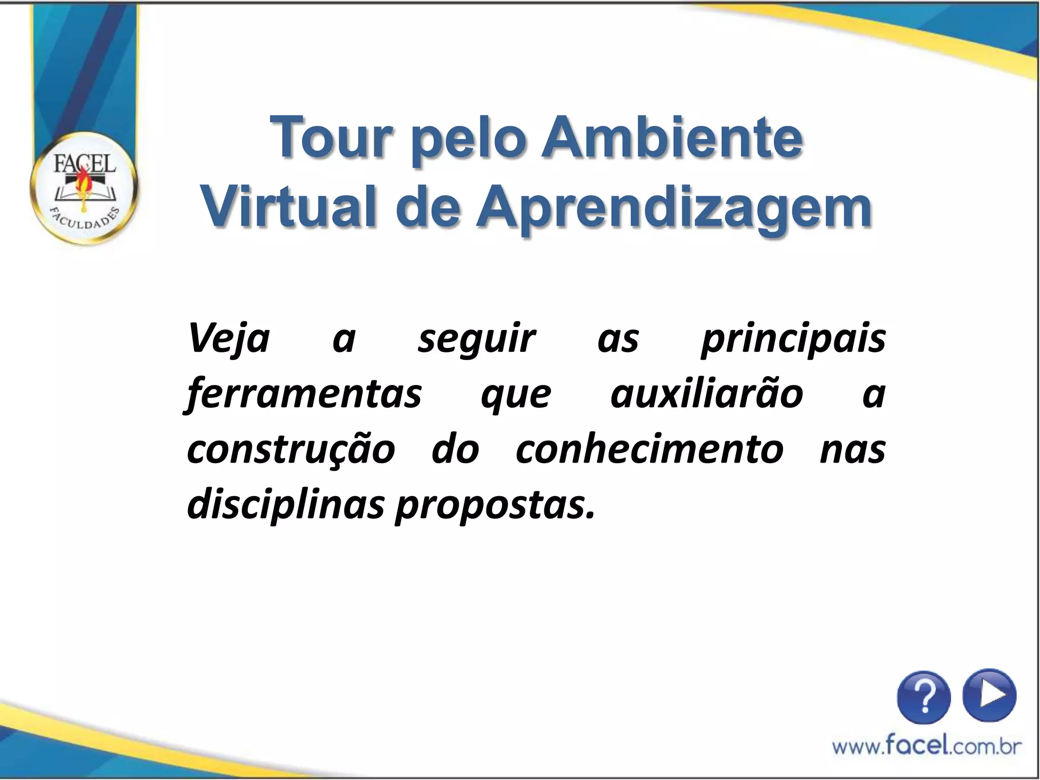 O documento fornece um tour pelo ambiente virtual de aprendizagem, descrevendo as principais ferramentas como recursos educacionais, discussões e a importância da autodisciplina para o sucesso no aprendizado a distância.
