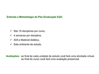 O documento descreve o modelo de pós-graduação a distância da Braz Cubas Educação, com 10 disciplinas por curso divididas em 4 semanas cada. Os alunos terão acesso a material didático no ambiente virtual de aprendizagem e fóruns de discussão, e realizarão atividades e avaliações ao final de cada unidade e do curso.