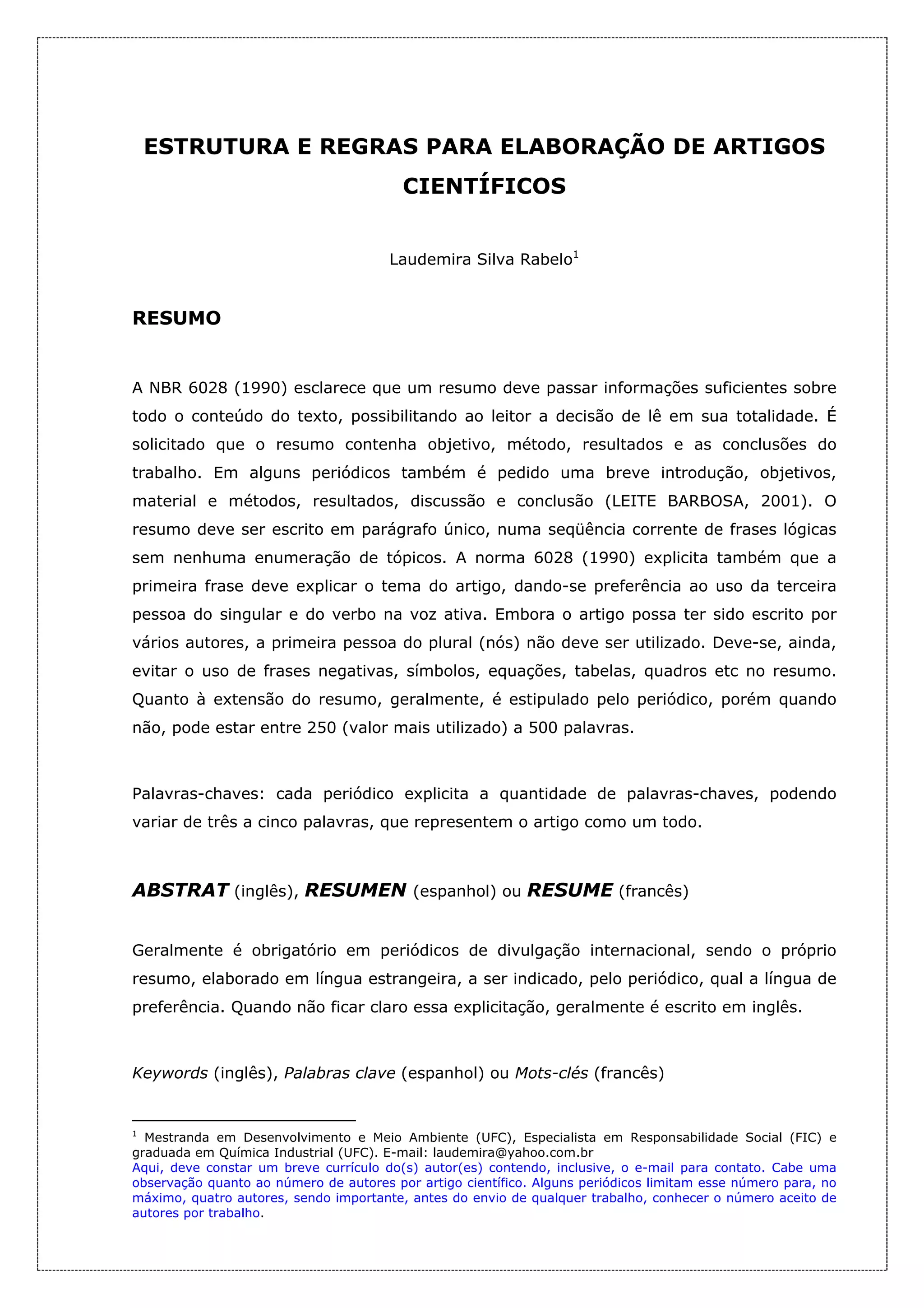 O documento fornece instruções sobre a estrutura e regras para elaboração de artigos científicos. Ele explica que o resumo deve resumir objetivo, método, resultados e conclusões e ter entre 250 a 500 palavras. Também discute a estrutura do artigo, incluindo introdução, desenvolvimento, considerações finais e referências bibliográficas.