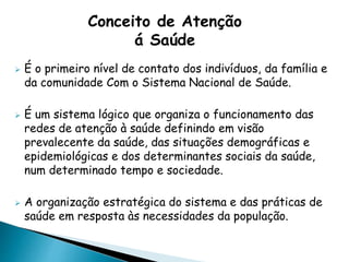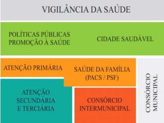 O documento discute os diferentes níveis do Sistema Único de Saúde brasileiro. A atenção primária é fornecida principalmente por meio do Programa Saúde da Família e inclui ações preventivas e de vigilância. A atenção secundária é regionalizada e fornecida por hospitais. A atenção terciária envolve serviços especializados de alta complexidade.