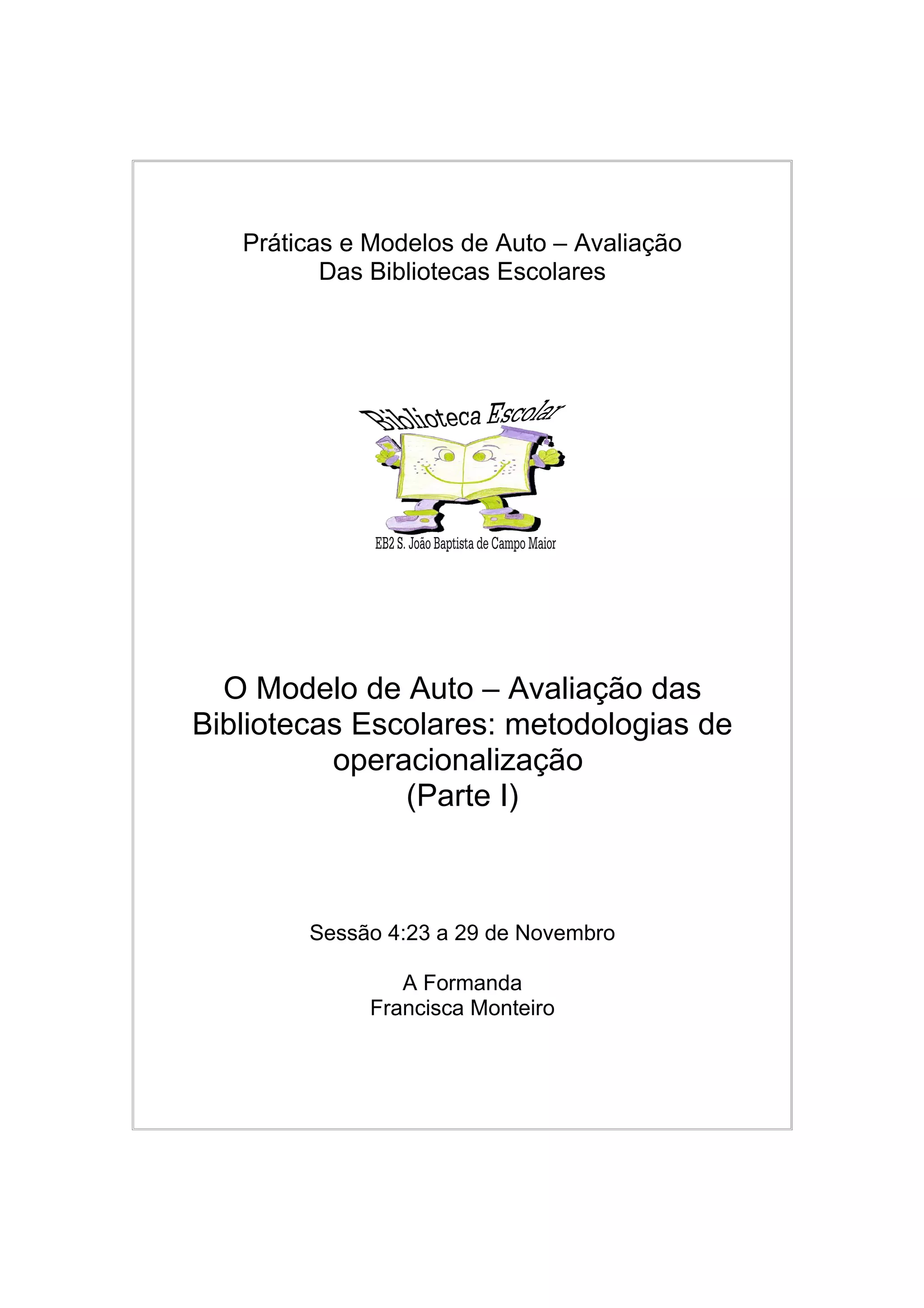 Este documento descreve o plano de autoavaliação da biblioteca escolar de um agrupamento de escolas em Campo Maior, Portugal. O plano inclui um diagnóstico dos pontos fortes e fracos da biblioteca, os domínios e indicadores que serão avaliados, como a promoção da leitura, e o cronograma para a coleta de evidências e a comunicação dos resultados. A biblioteca avaliará seu impacto nos hábitos de leitura dos alunos através de questionários, observações e estatísticas de uso.