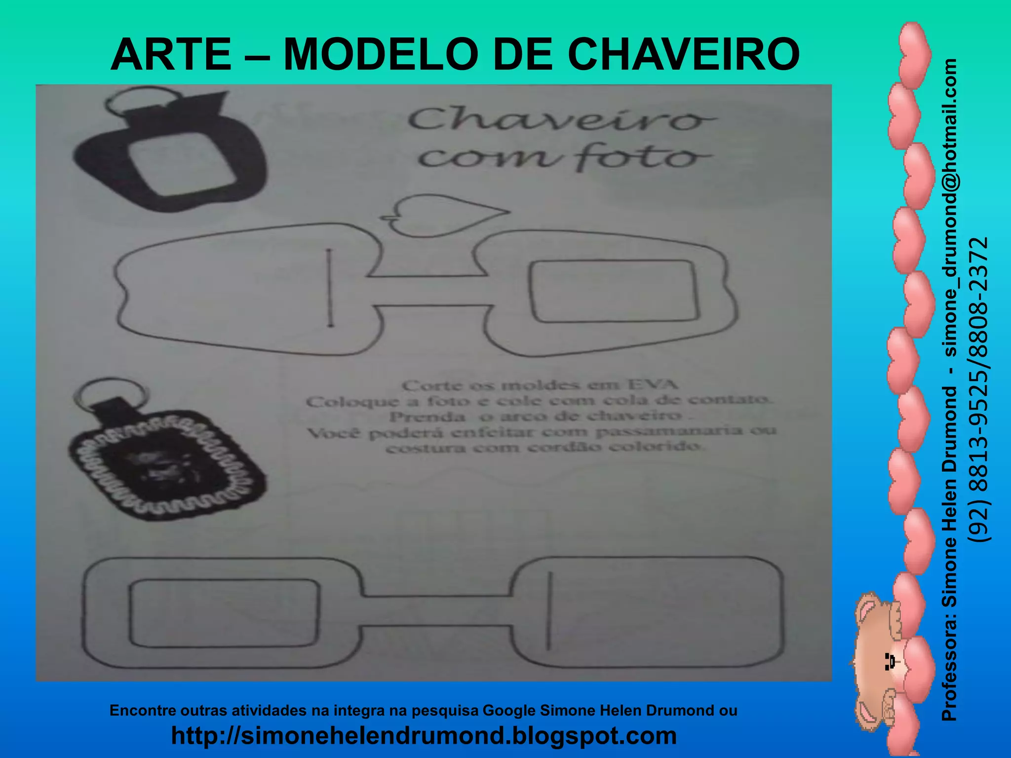 Contatos de uma professora de arte chamada Simone Helen Drumond, incluindo email e telefone, e instruções para encontrar mais atividades em seu blog ou pesquisando seu nome no Google, com detalhes de um projeto de chaveiro.