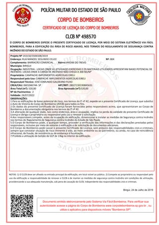 Este documento é um Certificado de Licença do Corpo de Bombeiros concedido à empresa Campache Implementos Agrícolas para uma edificação industrial localizada em Birigui, São Paulo. O certificado aprova o uso de 520m2 da edificação de 2 pavimentos para fins industriais de baixo risco de incêndio, válido até 24 de julho de 2022.