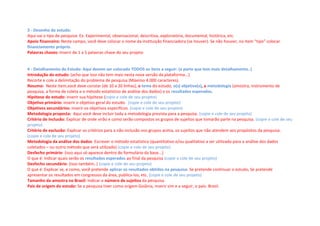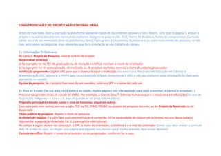 1. O documento fornece instruções sobre como preencher um projeto de pesquisa na plataforma Brasil, incluindo anexar documentos, preencher campos de informações preliminares, área de estudo, objetivos, metodologia e outros detalhes.