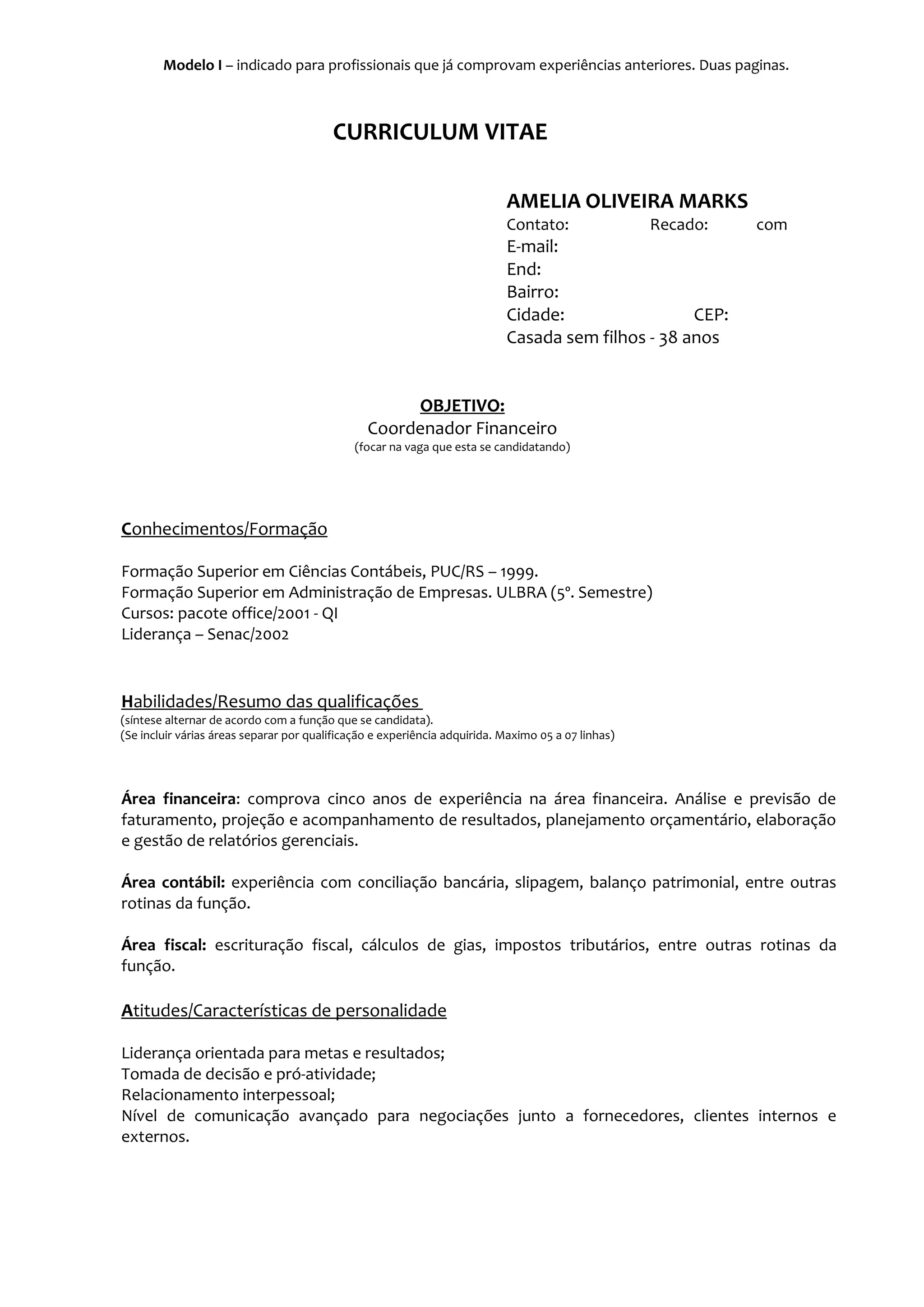 Amelia Oliveira Marks tem 38 anos e experiência em áreas financeira, contábil e fiscal, tendo ocupado cargos como Coordenador Financeiro e Analista Contábil. Ela possui formação superior em Ciências Contábeis e Administração de Empresas, além de cursos de especialização e idiomas. Busca atuar como Coordenador Financeiro, tendo habilidades em análise e previsão de resultados, planejamento orçamentário e elaboração de relatórios.