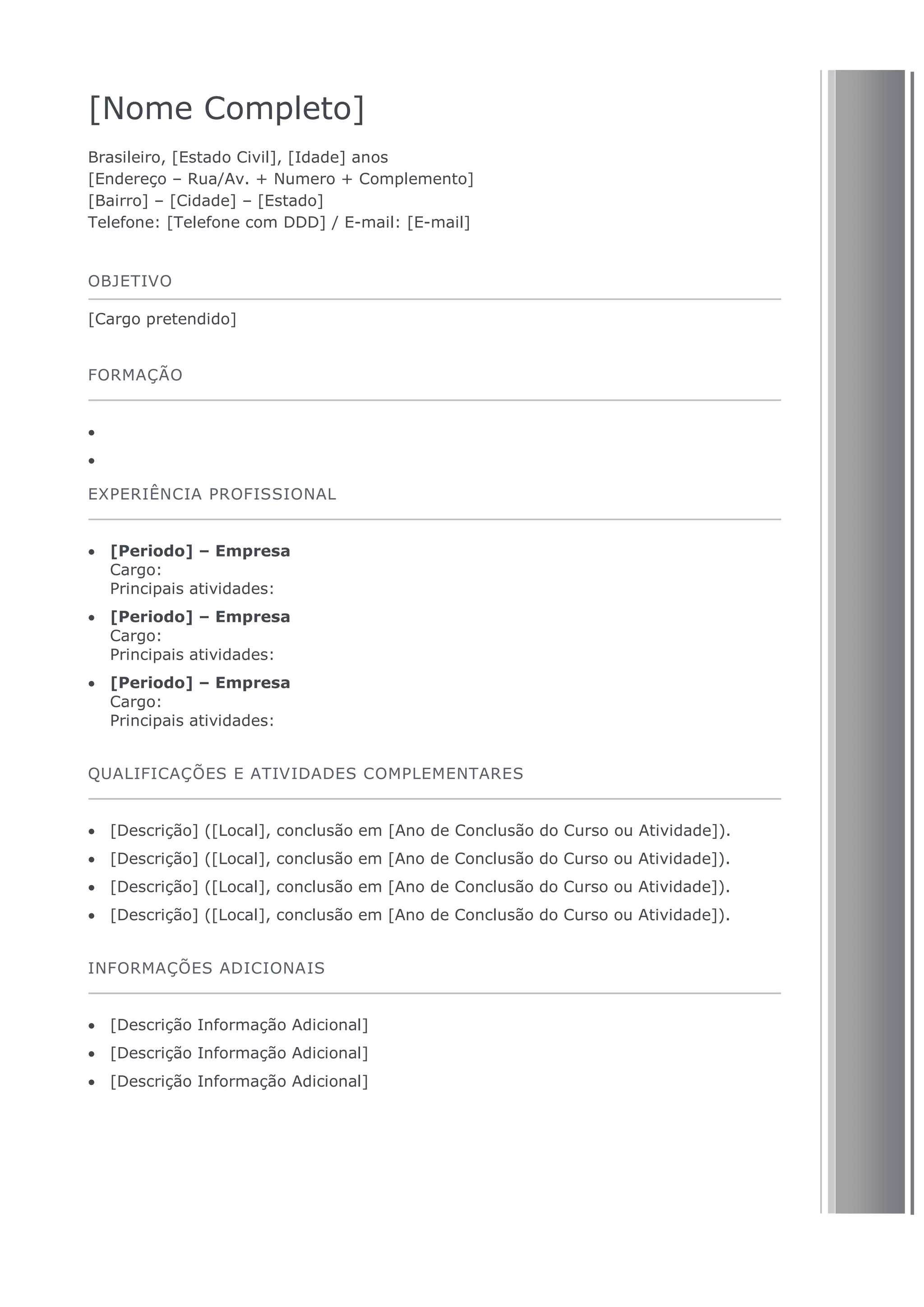 Este currículo apresenta os dados pessoais, formação, experiência profissional e qualificações de um indivíduo brasileiro, casado, com idade de [Idade] anos, residente em [Cidade]-[Estado], que busca a vaga de [Cargo pretendido].