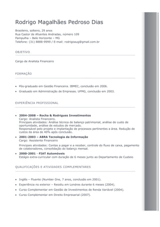 Rodrigo Magalhães Pedroso Dias, brasileiro de 29 anos, busca uma vaga como Analista Financeiro. Ele possui pós-graduação em Gestão Financeira e graduação em Administração de Empresas, além de experiência como Analista Financeiro e Assistente Financeiro. Rodrigo fala inglês fluentemente e tem qualificações complementares em investimentos e direito empresarial.