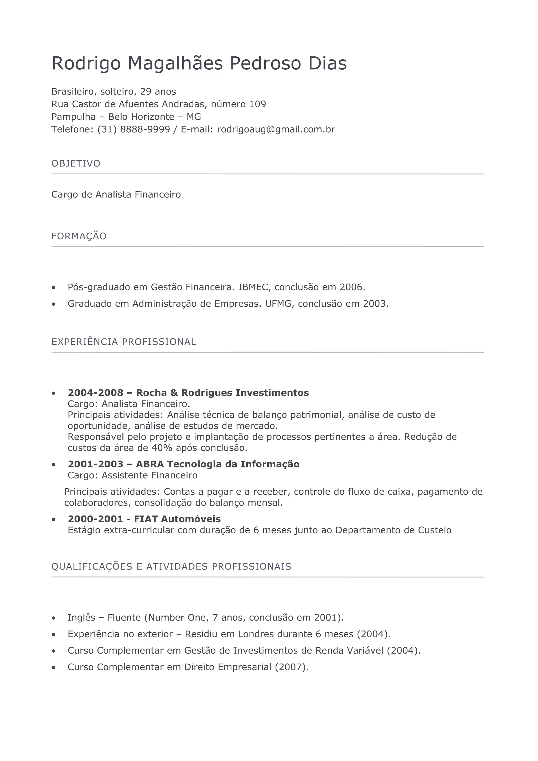 Rodrigo Magalhães Pedroso Dias, brasileiro de 29 anos, busca uma vaga como Analista Financeiro. Ele possui pós-graduação em Gestão Financeira e graduação em Administração de Empresas, além de experiência como Analista Financeiro e Assistente Financeiro. Rodrigo também tem qualificações como fluência em inglês e cursos complementares em gestão de investimentos e direito empresarial.