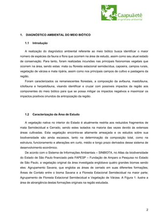 Este documento fornece um resumo do diagnóstico ambiental da área de estudo, focando no meio biótico. Ele caracteriza a vegetação original e atual, identificando remanescentes florestais, áreas de importância biológica e espécies da flora e fauna local. O levantamento florístico apontou 87 espécies arbóreas, incluindo duas ameaçadas de extinção. O objetivo é subsidiar a avaliação do estado de conservação e a recomposição florestal na região.