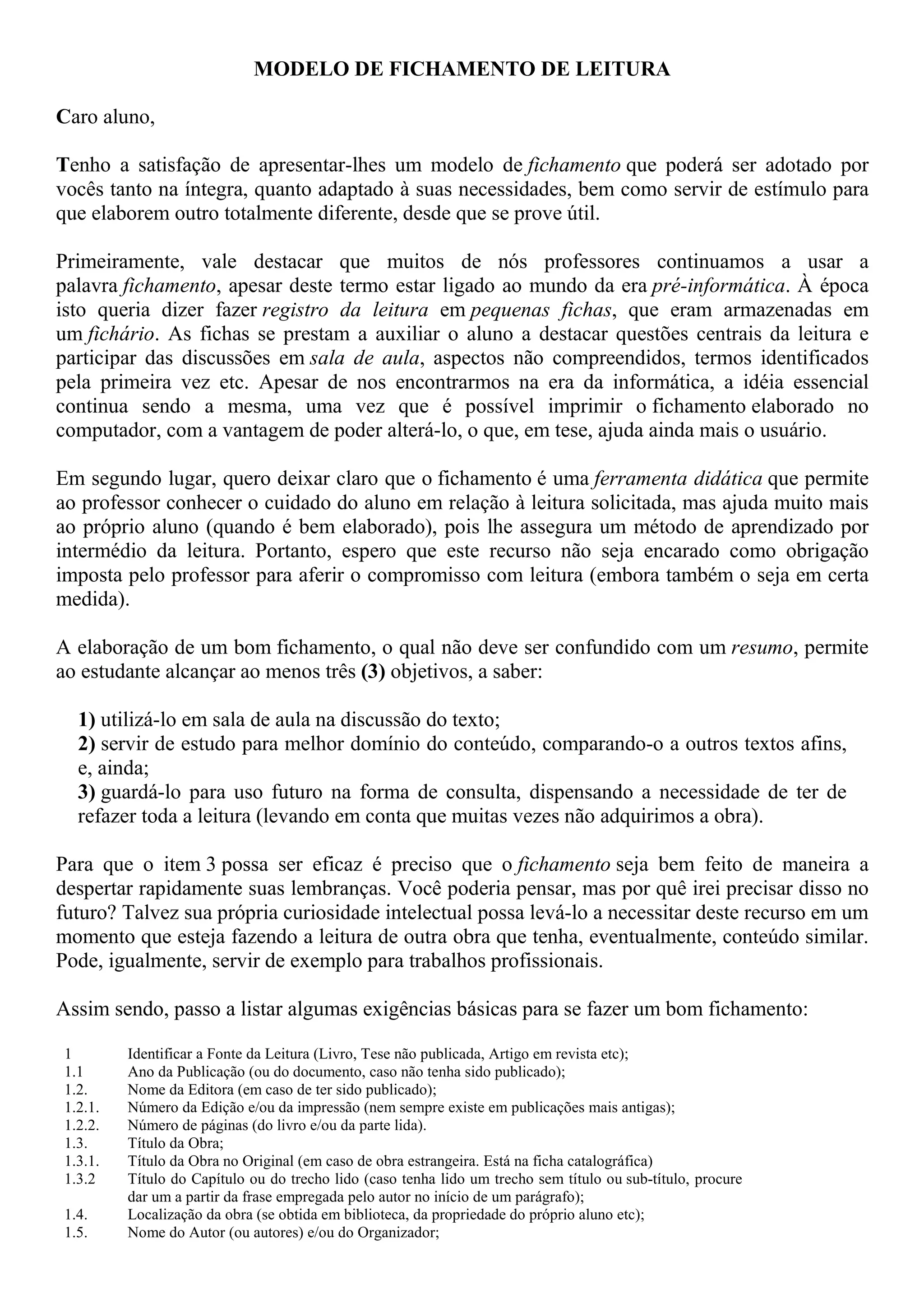O documento apresenta um modelo de fichamento de leitura para auxiliar os alunos a registrar as informações essenciais de textos lidos. O modelo inclui seções para identificar a fonte, tema, palavras-chaves, ideias principais, trechos, conceitos, referências e comentários do aluno. O objetivo é permitir que os alunos participem de discussões, estudem o conteúdo e o utilizem no futuro como consulta.