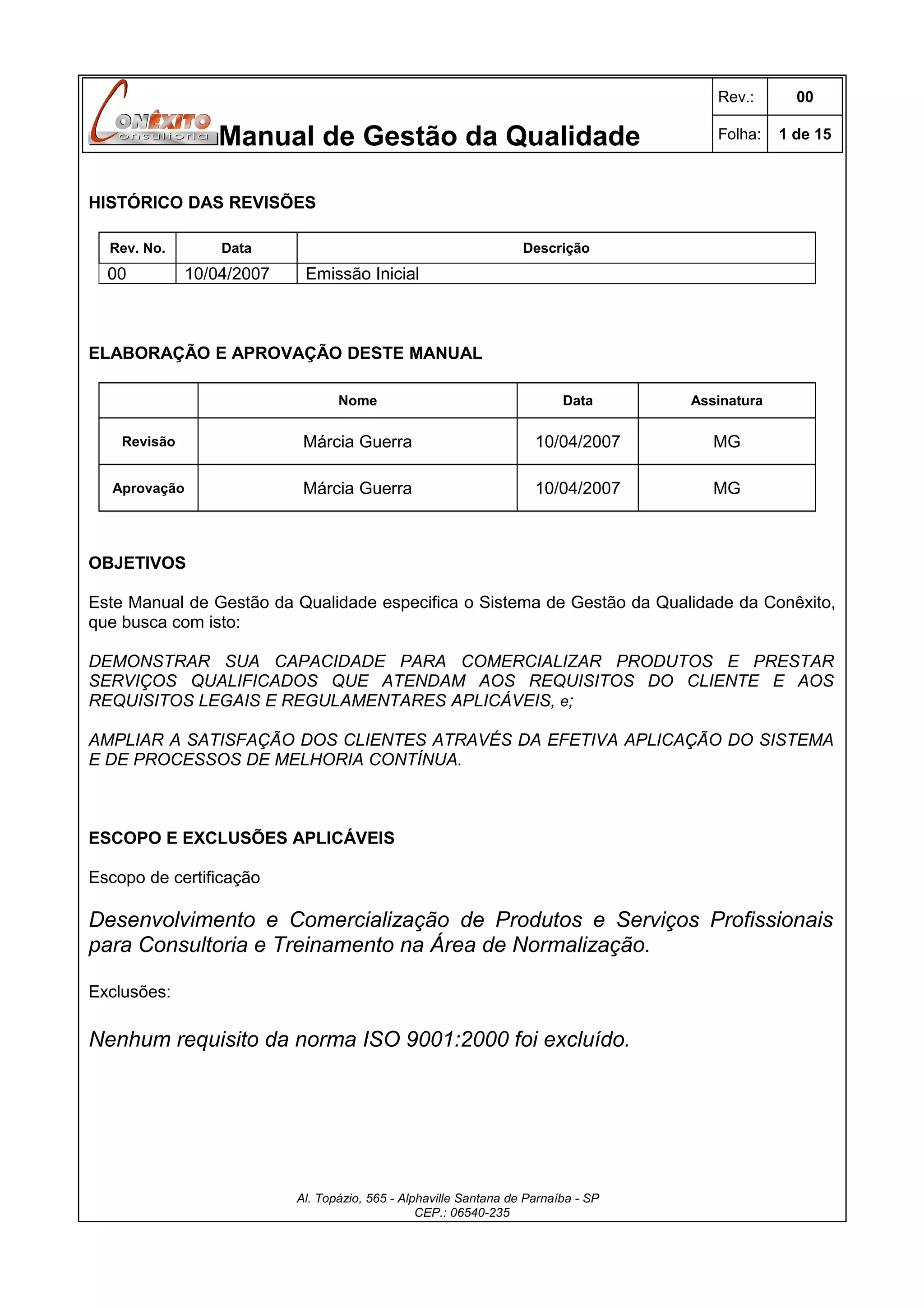 Este manual descreve o sistema de gestão da qualidade da Conêxito, incluindo sua política de qualidade, objetivos, escopo, documentação requerida, responsabilidades da direção e gestão de recursos. Apresenta também a organização e seus produtos e serviços.
