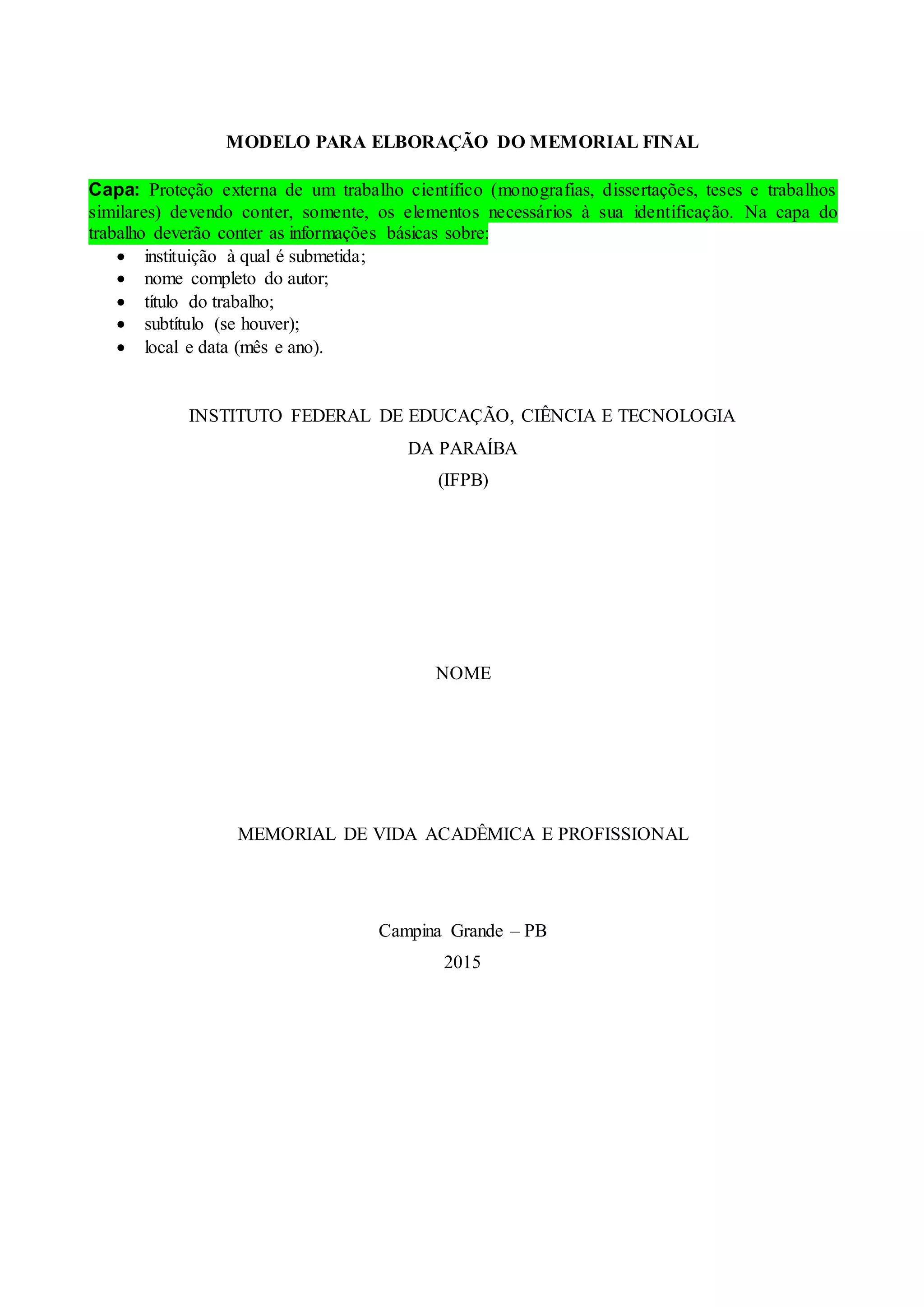 1. O documento fornece instruções sobre a estrutura e formatação de um memorial final, incluindo elementos obrigatórios como capa, folha de rosto, sumário, referências, anexos e apêndices.