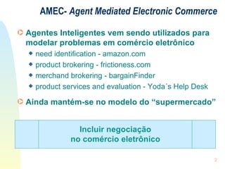 O documento discute modelos de negociação bilateral para comércio eletrônico. Apresenta problemas comuns em modelos atuais e propõe um novo modelo que corrige limitações, incluindo atributos de produto e acordo, avaliação multifatorial de propostas, e ações complexas como sugestão de produtos alternativos.