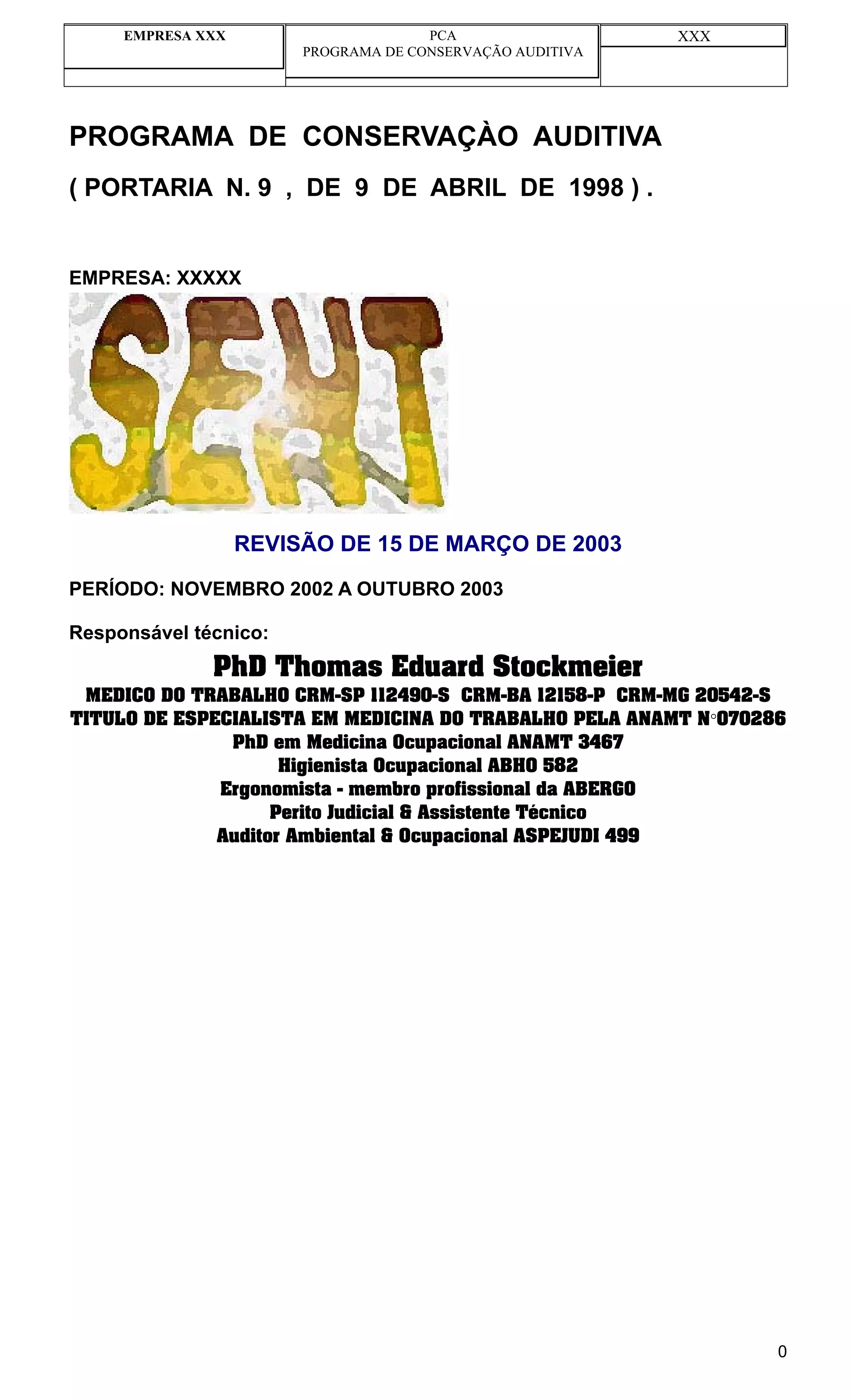 Este documento descreve o Programa de Conservação Auditiva de uma empresa de construção civil, com o objetivo de prevenir a perda auditiva dos trabalhadores devido à exposição a níveis elevados de ruído. Ele define os procedimentos para monitoramento do ruído ambiental e dos equipamentos, exames audiométricos dos funcionários, uso de equipamentos de proteção e educação sobre saúde auditiva. O programa também estabelece responsabilidades para sua implementação entre os níveis gerenciais, de segurança e medicina do trabalho.
