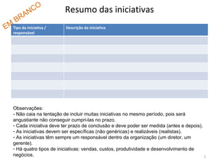 1. O documento apresenta um plano de ação para uma empresa com quatro iniciativas principais: vendas, custos, produtividade e desenvolvimento de negócios.