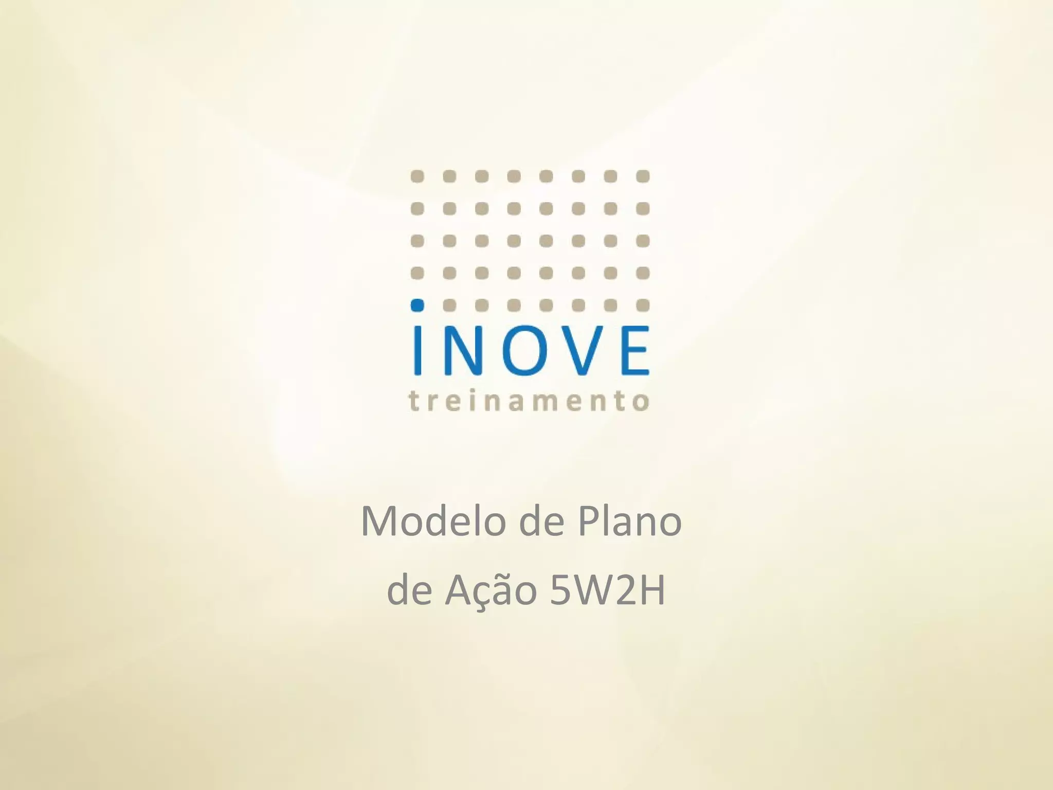 O documento apresenta o modelo de plano de ação 5W2H, que descreve os elementos essenciais de um plano de ação, incluindo o que fazer, por que fazer, onde fazer, quando fazer, quem fará, como será feito e quanto custará.