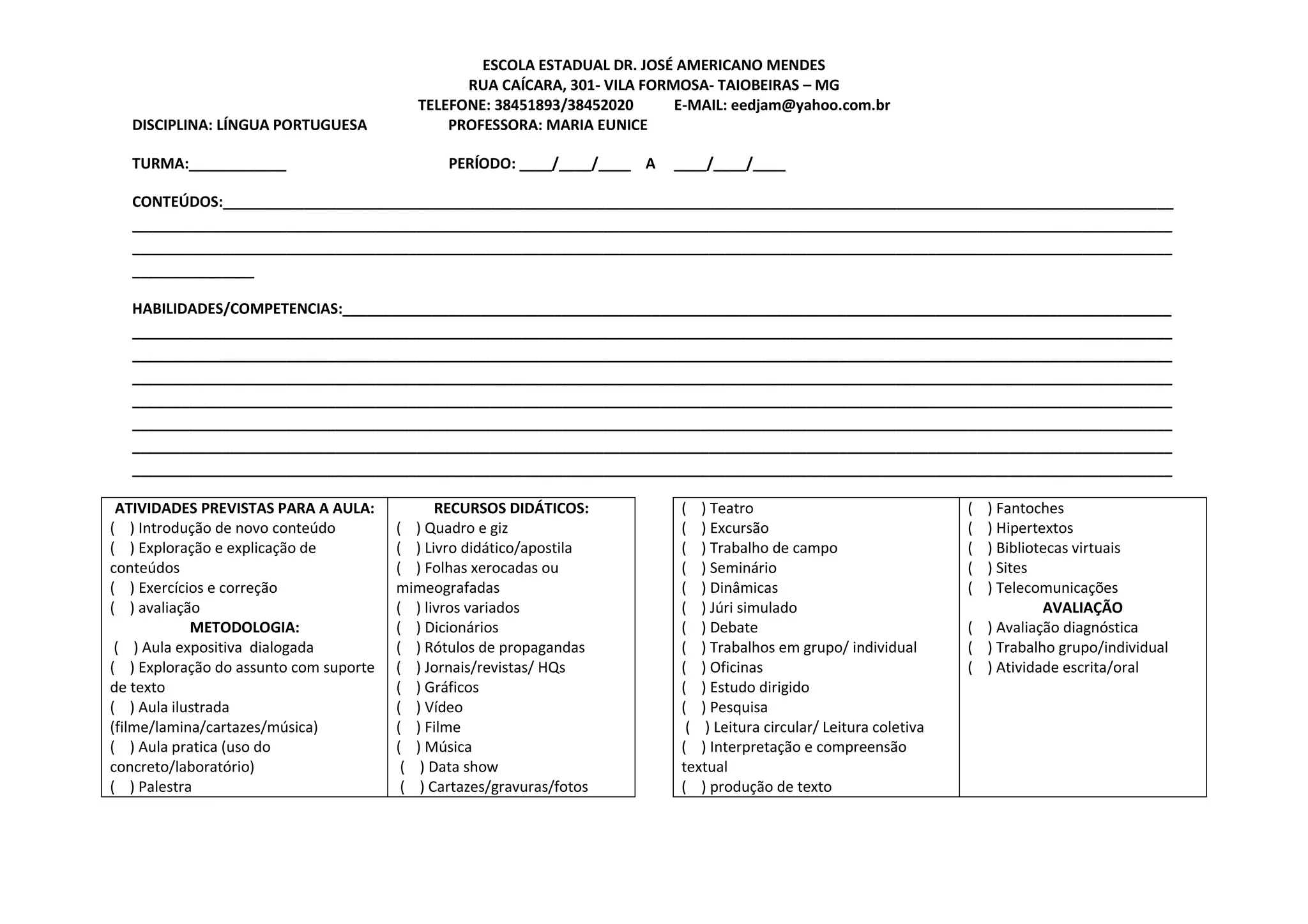 Este documento apresenta o planejamento de uma aula de Língua Portuguesa na Escola Estadual Dr. José Americano Mendes. Ele detalha o conteúdo, habilidades, atividades, metodologia, recursos didáticos e avaliação previstos para a aula, ministrada pela professora Maria Eunice.