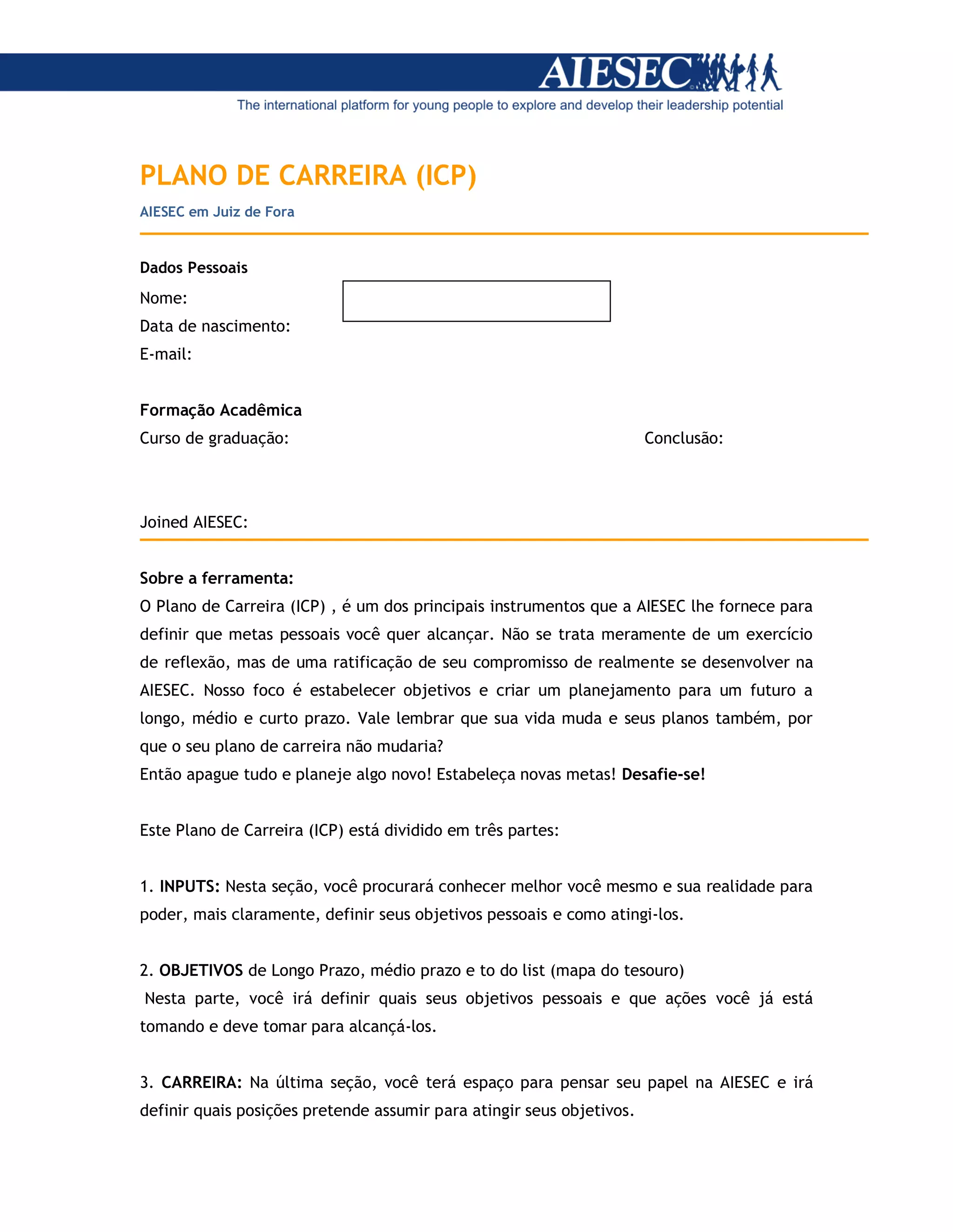 [1] O documento apresenta um plano de carreira dividido em três partes: autoconhecimento, definição de objetivos de curto, médio e longo prazo, e planejamento de carreira. [2] Na primeira parte, pede para avaliar competências e línguas, e escolher três competências para desenvolver. [3] Na segunda parte, define objetivos para daqui a 6 meses e 1 ano considerando vida pessoal, família, carreira e estudos.