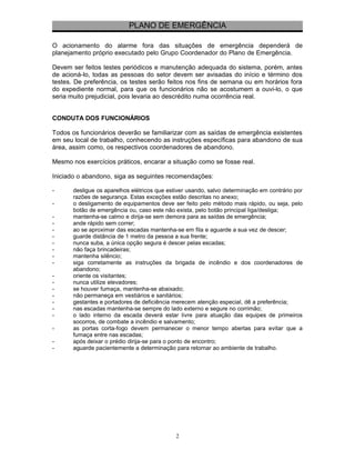 Este documento apresenta um plano de emergência para evacuação rápida e segura de um edifício em caso de incêndio ou outra emergência. O plano descreve os procedimentos para detecção de emergências, acionamento de alarmes, conduta dos funcionários durante a evacuação, e responsabilidades dos grupos de brigada e coordenação.