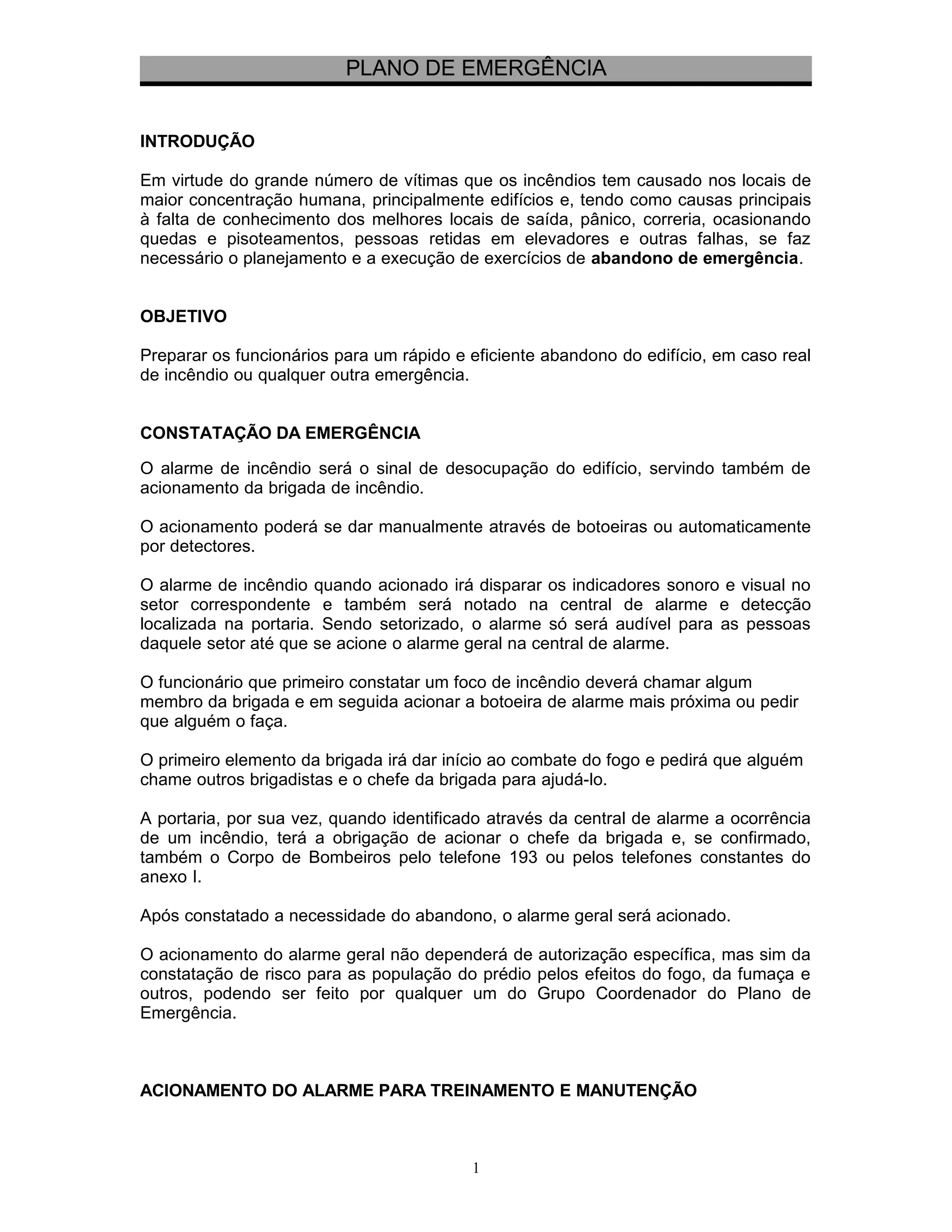 Este documento apresenta um plano de emergência para evacuação rápida e segura de um edifício em caso de incêndio ou outra emergência. O plano descreve os procedimentos para detecção de emergências, acionamento de alarmes, conduta dos funcionários durante a evacuação, e responsabilidades dos grupos de brigada e coordenação.