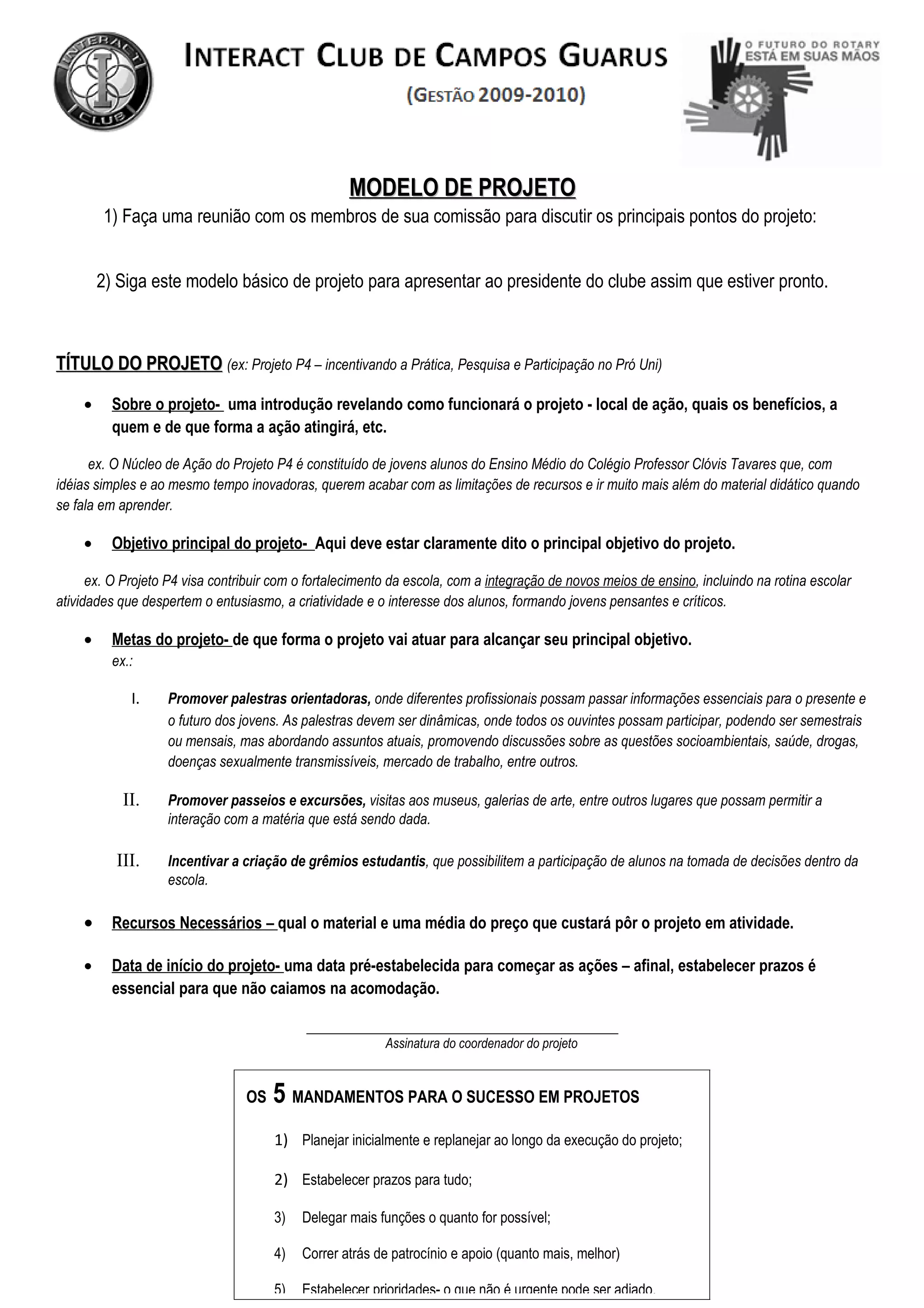 O documento fornece um modelo para projetos que inclui título, introdução, objetivo principal, metas, recursos necessários, data de início e assinatura do coordenador. Ele também lista cinco mandamentos para o sucesso em projetos como planejamento inicial e contínuo, estabelecer prazos, delegar tarefas, buscar apoio e estabelecer prioridades.