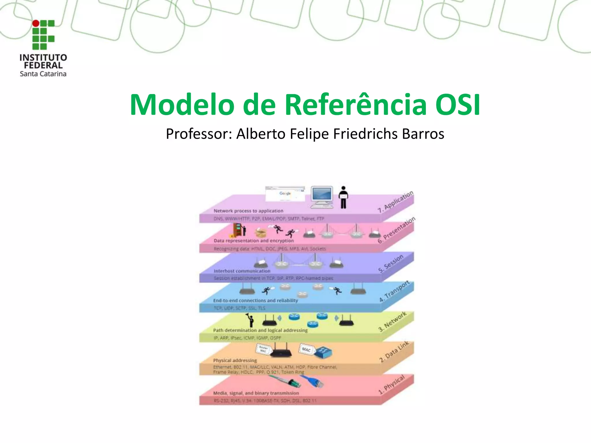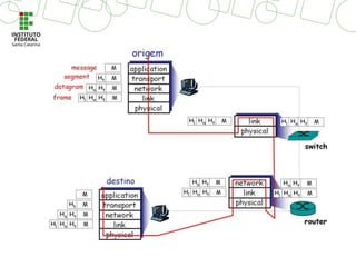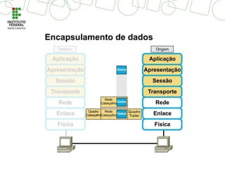 O documento descreve o Modelo de Referência OSI, que divide o processo de comunicação em sete camadas: 1) Aplicação, 2) Apresentação, 3) Sessão, 4) Transporte, 5) Rede, 6) Enlace e 7) Física. Cada camada implementa funções específicas para permitir a comunicação entre sistemas, como formatar dados, estabelecer conexões, rotear pacotes e transmitir bits. Juntas, as camadas do modelo OSI fornecem um guia para projetar sistemas de comunicação de rede de forma estrutur