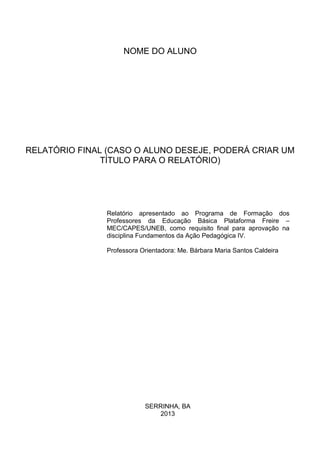 O documento apresenta um modelo de relatório final para alunos do Programa de Formação de Professores da Educação Básica da UNEB. O relatório deve conter introdução, desenvolvimento, considerações finais, referências e anexos. O desenvolvimento deve incluir planejamento, análise de aulas, reflexões sobre ensino de história e estágio docente.