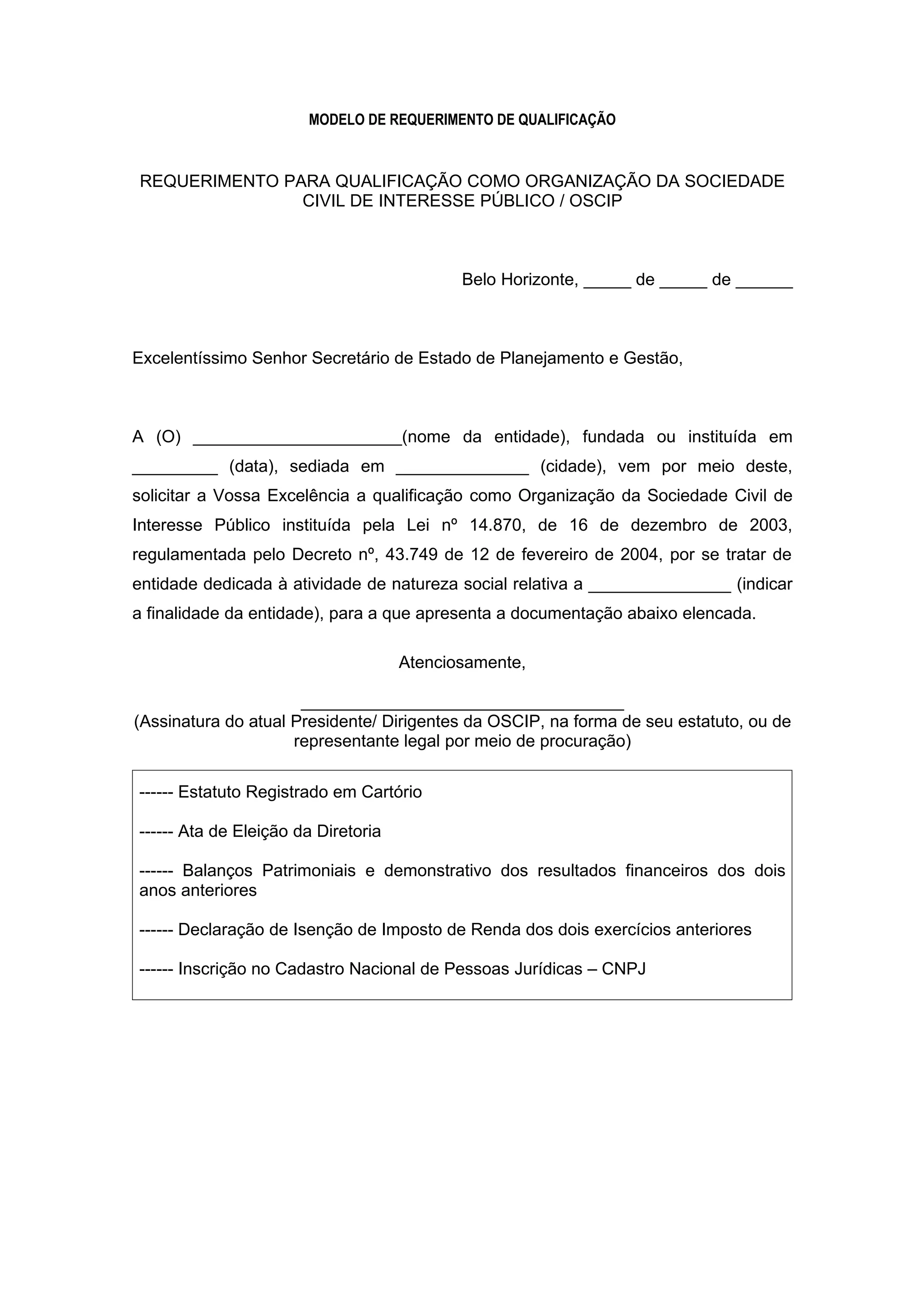 Este documento é um pedido de qualificação como Organização da Sociedade Civil de Interesse Público (OSCIP) enviado ao Secretário de Estado de Planejamento e Gestão. A entidade solicita a qualificação por se dedicar a atividades sociais relacionadas a [finalidade da entidade] e anexa documentos como estatuto, ata de eleição da diretoria, balanços financeiros e declaração de isenção de imposto de renda dos últimos dois anos.