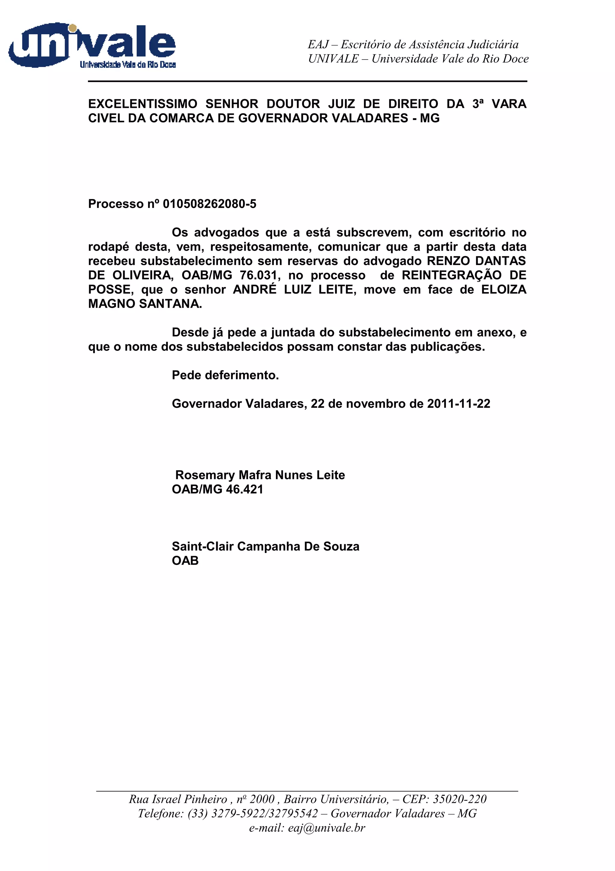 Dois advogados de um escritório de assistência judiciária comunicam ao juiz que receberam o substabelecimento de um terceiro advogado em um processo de reintegração de posse movido por André Luiz Leite contra Eloiza Magno Santana. Eles pedem que o nome do advogado substabelecido conste nas publicações do caso.