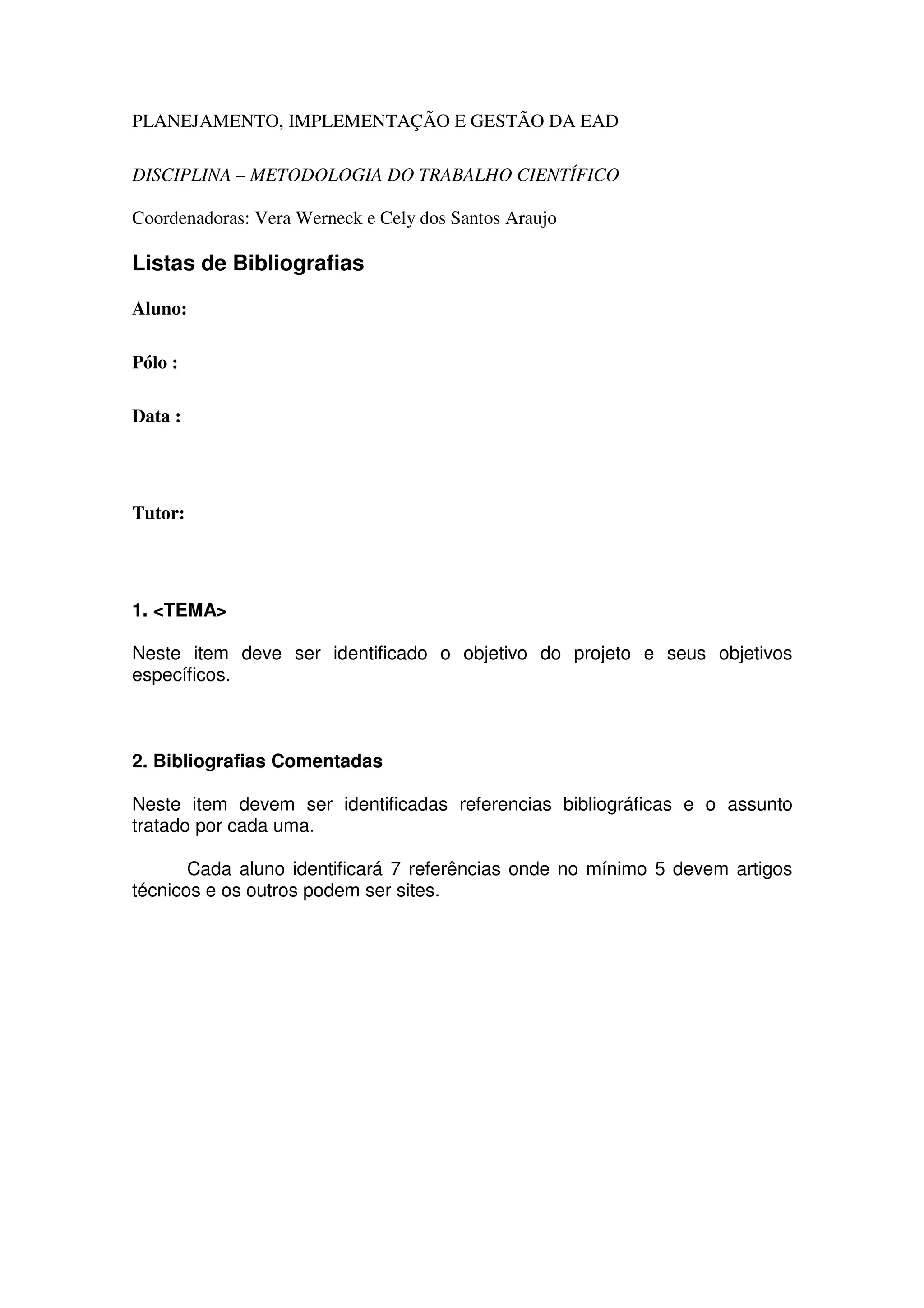 Este documento fornece instruções para estudantes sobre como planejar, implementar e gerenciar um projeto de EAD, incluindo identificar o objetivo geral e específico do projeto, listar e comentar 7 referências bibliográficas relevantes com pelo menos 5 sendo artigos técnicos.