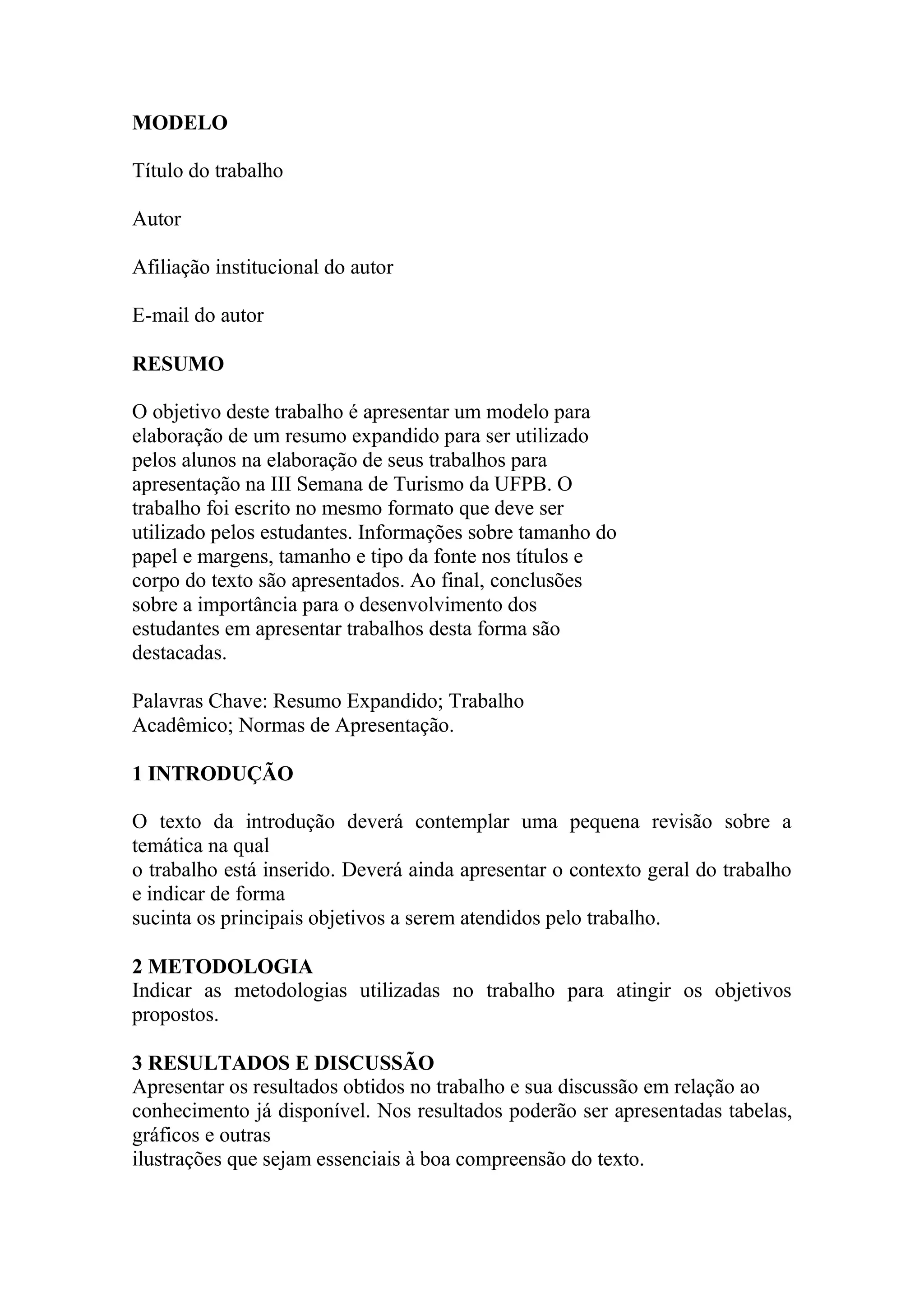 Este documento fornece um modelo para resumos expandidos a serem utilizados por alunos em trabalhos para uma conferência de turismo. Ele inclui informações sobre formato, fontes, margens e seções como introdução, metodologia, resultados e considerações finais. O objetivo é ajudar os alunos a apresentarem trabalhos acadêmicos de forma padronizada.
