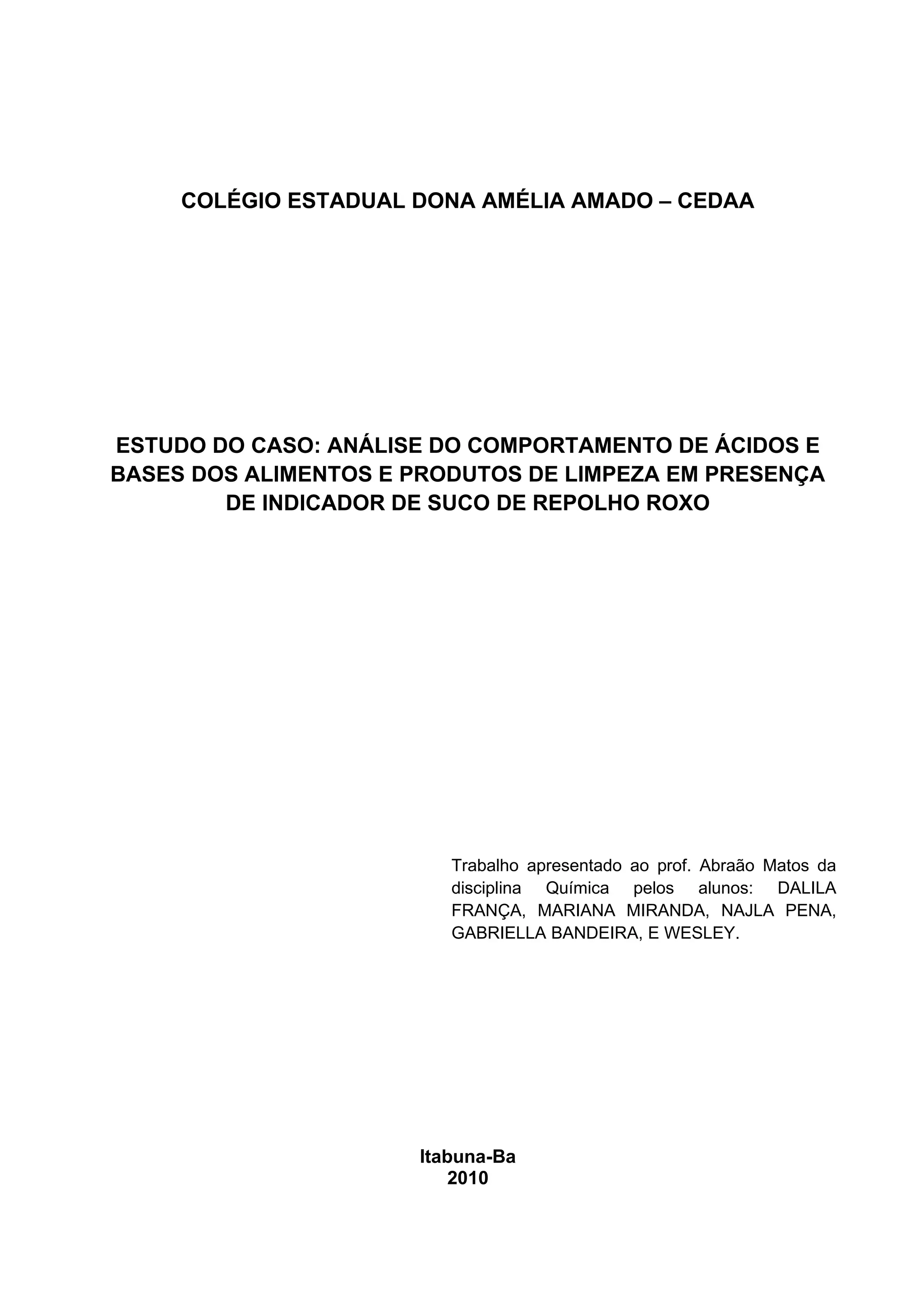 O documento apresenta um estudo de caso sobre a análise do comportamento de ácidos e bases de alimentos e produtos de limpeza na presença de indicador de suco de repolho roxo. Os alunos realizaram experimentos misturando o suco com diferentes substâncias e observaram as mudanças de cor para determinar os níveis de acidez. As conclusões demonstraram que os alunos aprenderam sobre reações químicas em ácidos e cálculo de pH.