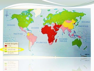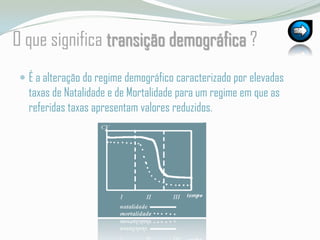 O documento descreve o modelo de transição demográfica, dividindo-o em quatro fases: 1) Regime demográfico primitivo com altas taxas de natalidade e mortalidade; 2) 1a fase de transição com queda da mortalidade e crescimento populacional; 3) 2a fase com queda da natalidade e desaceleração do crescimento; 4) Regime demográfico moderno com baixas taxas de natalidade e mortalidade e fraco crescimento natural. Também diferencia países desenvolvidos que já passaram por todas as f