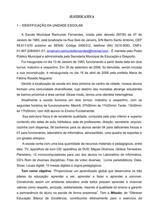 Este documento fornece detalhes sobre a Escola Municipal Raimundo Fernandes, incluindo sua localização, estrutura, objetivos, desempenho acadêmico e indicadores. A escola atende 410 alunos dos anos iniciais com taxas de aprovação de 93,6% em 2013 e nota IDEB de 5,3, demonstrando bons resultados educacionais.