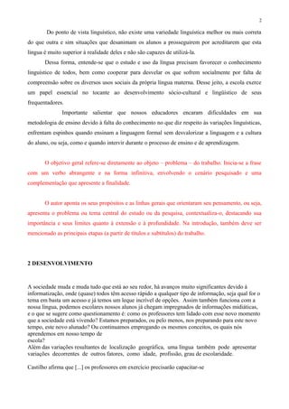 O documento discute as variedades linguísticas no Brasil, levando em consideração fatores como a extensão territorial e diversidades sociais e culturais. O objetivo é identificar essas variedades linguísticas dada a lacuna no entendimento dessas questões. A introdução apresenta o tema e sua relevância.