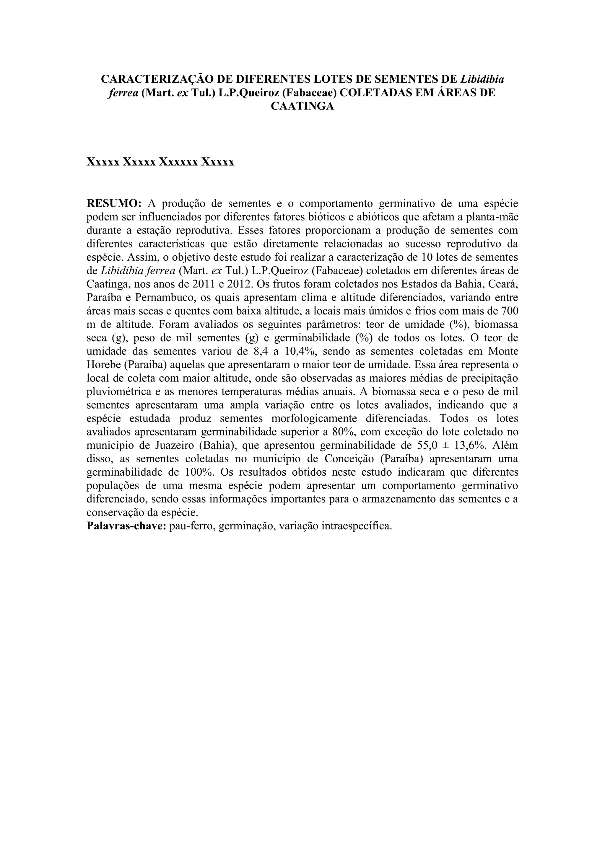 Este estudo caracterizou 10 lotes de sementes de Libidibia ferrea coletadas em diferentes áreas de Caatinga no Brasil. Os resultados mostraram que os lotes variaram no teor de umidade, biomassa seca, peso de mil sementes e taxa de germinação, indicando que fatores ambientais influenciam a produção e qualidade das sementes. A maior taxa de germinação foi observada em sementes de uma área mais úmida e de maior altitude.