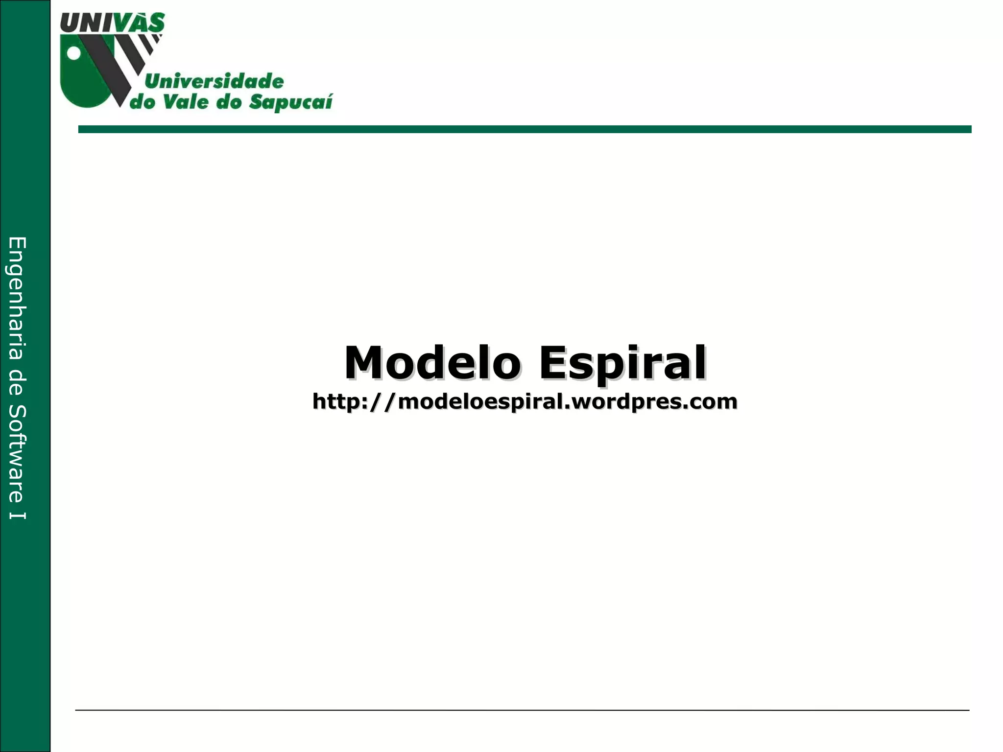 O Modelo Espiral define um processo iterativo e incremental para desenvolvimento de software. Cada fase envolve análise de riscos, engenharia e prototipagem para avaliar viabilidade do projeto. O modelo permite lidar melhor com mudanças e descobrir problemas cedo, mas requer experiência em avaliação de riscos.