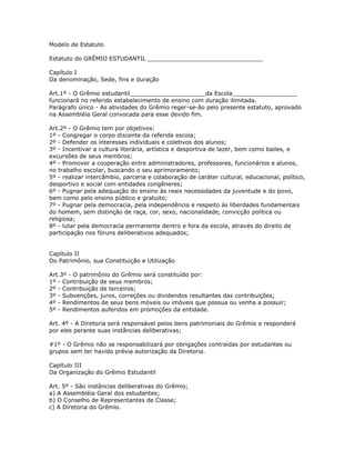 Este estatuto define a organização e objetivos de um grêmio estudantil. Ele estabelece que o grêmio será composto por todos os alunos matriculados na escola e terá como objetivos defender os interesses dos estudantes, promover atividades culturais e esportivas, e incentivar a cooperação entre a comunidade escolar. O estatuto também define a estrutura de governança do grêmio, incluindo a assembléia geral, o conselho de representantes e a diretoria.