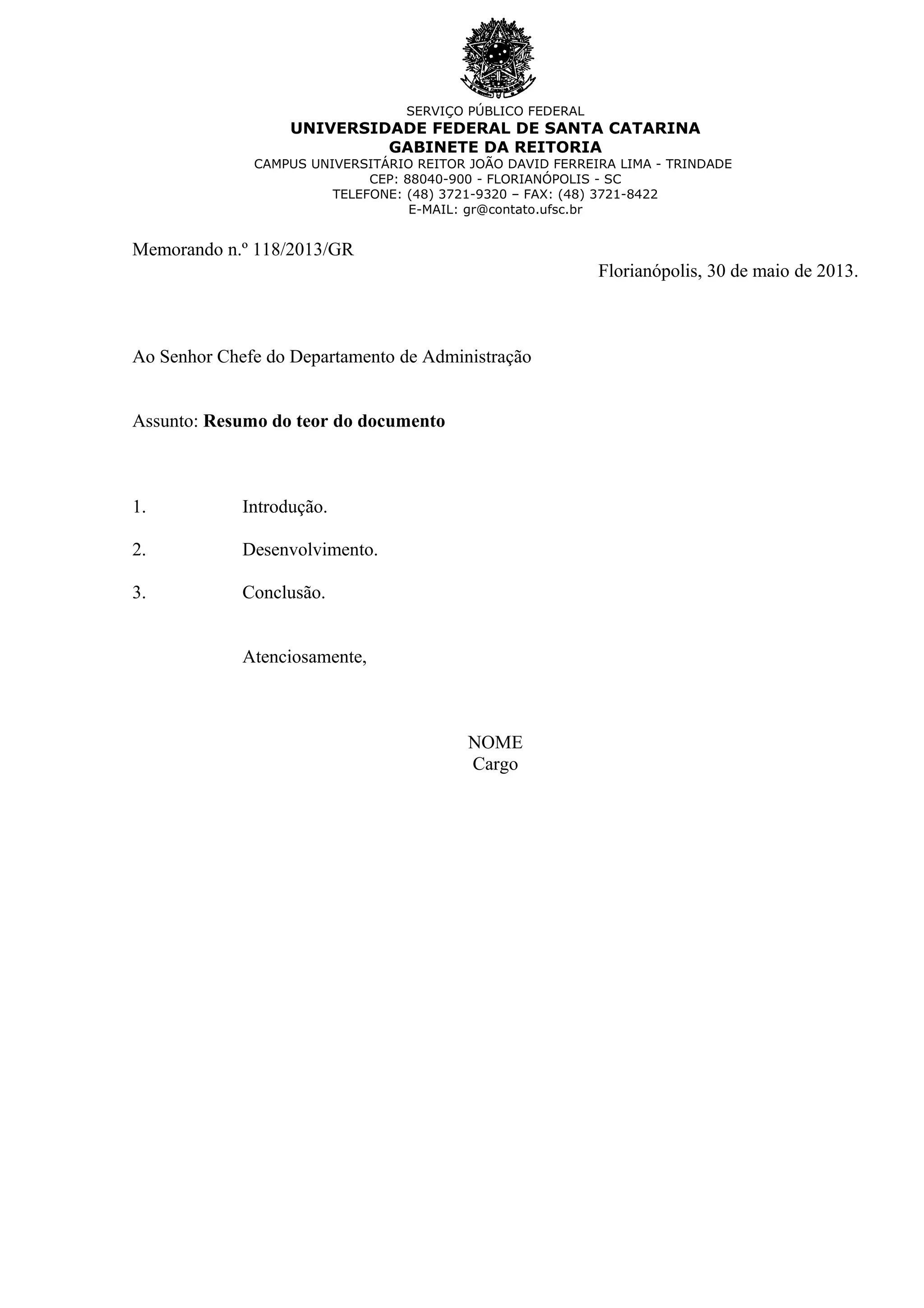 O memorando é da Reitoria da Universidade Federal de Santa Catarina enviado ao Chefe do Departamento de Administração. Resume o conteúdo do documento em três partes: introdução, desenvolvimento e conclusão.