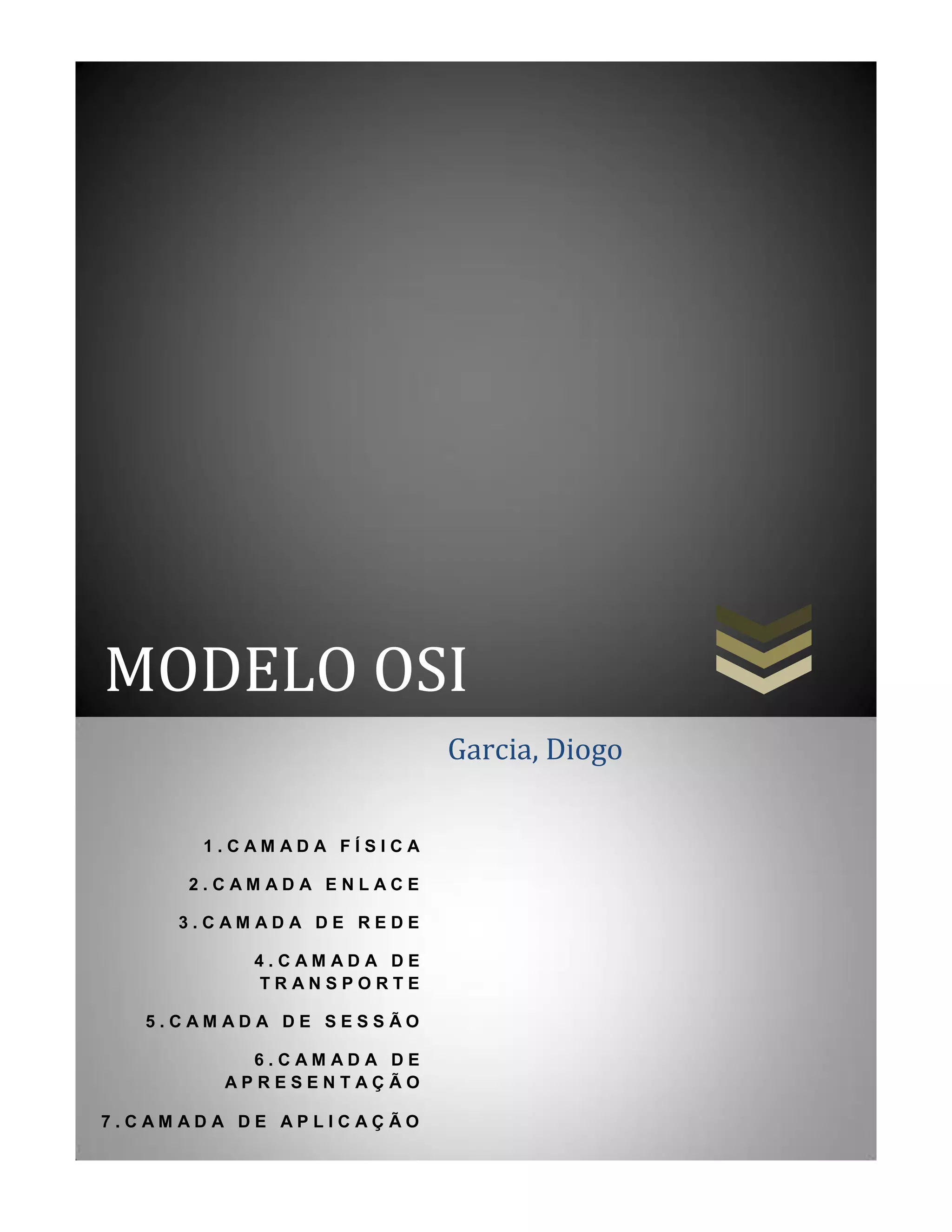 O documento descreve as sete camadas do Modelo OSI, incluindo a Camada Física, a Camada de Enlace, a Camada de Rede, a Camada de Transporte, a Camada de Sessão, a Camada de Apresentação e a Camada de Aplicação.