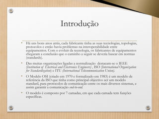 O documento descreve o Modelo OSI, um modelo de referência para protocolos de comunicação entre sistemas. O Modelo OSI divide o processo de comunicação de dados em sete camadas, cada uma com funções específicas. Exemplifica como uma solicitação de página web funciona de acordo com cada camada do modelo.