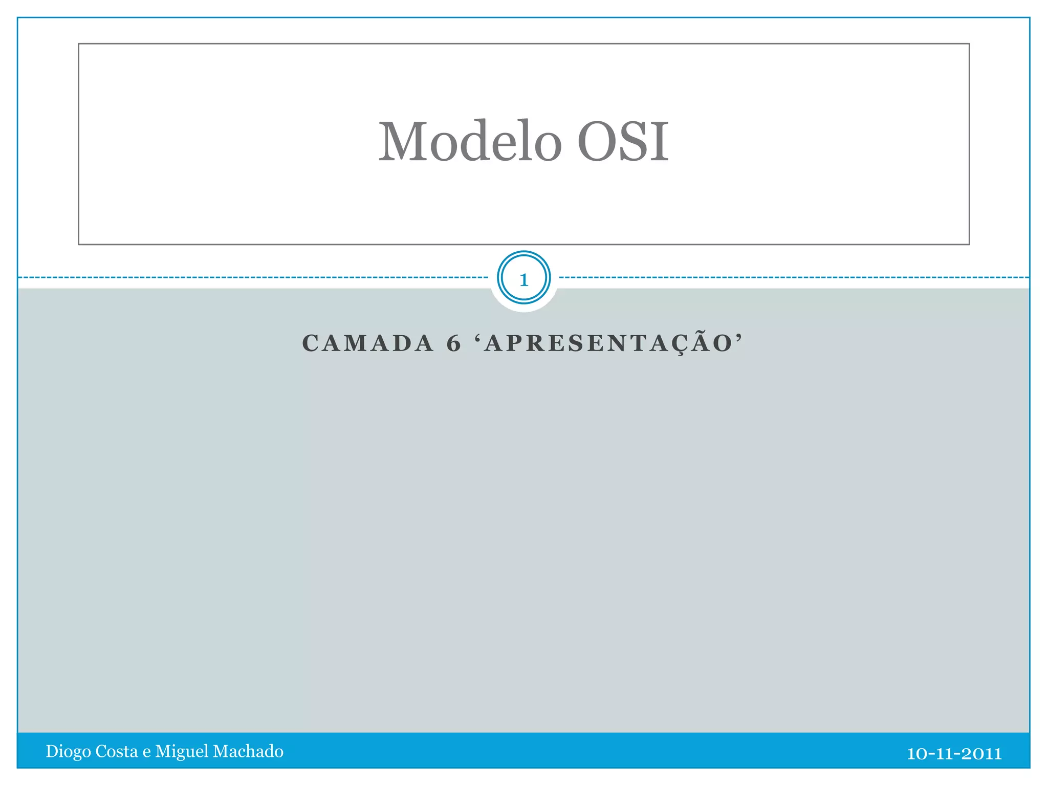 O documento descreve o modelo OSI de comunicação em rede, especificamente a camada 6 de apresentação. A camada 6 converte os dados em um formato comum para transmissão e descodificação, como conversão de caracteres ou compressão/criptografia de dados.
