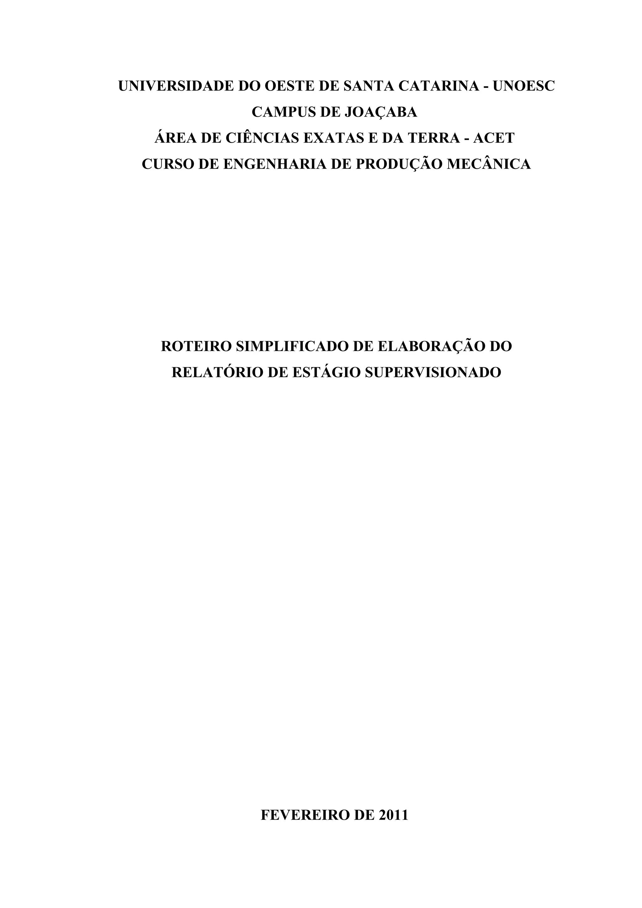 Este documento fornece orientações sobre a elaboração do relatório de estágio supervisionado do curso de Engenharia de Produção Mecânica da Universidade do Oeste de Santa Catarina. Ele explica a estrutura do relatório com base na norma ABNT 14724, incluindo elementos pré-textuais, textuais e pós-textuais. Além disso, fornece instruções detalhadas sobre como preencher cada seção do relatório, como introdução, fundamentação teórica, metodologia, resultados e discussões e conclusões.