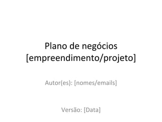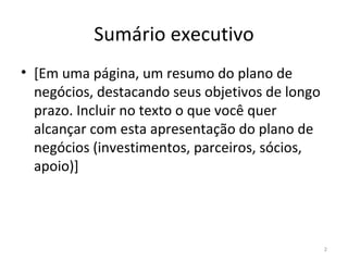 O documento apresenta um plano de negócios para um novo empreendimento. Detalha o mercado-alvo, a oportunidade identificada e a solução proposta. Apresenta também informações sobre o modelo de negócios, marketing, finanças e equipe necessária para executar o plano.