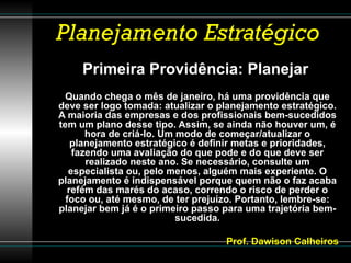 O documento discute a importância do planejamento estratégico para empresas e profissionais. Ele recomenda definir metas e prioridades para o ano, avaliando o que pode e deve ser realizado. Também discute elementos como missão, objetivos, visão de futuro, unidades estratégicas de negócios e funcionais, indicadores de desempenho e projetos estratégicos.