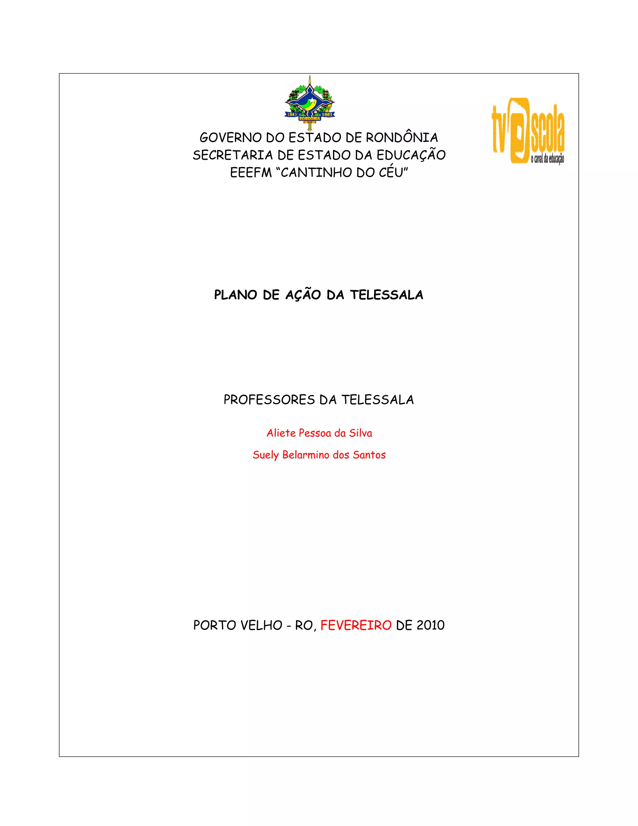 O documento apresenta o plano de ação da telessala da escola EEEFM "Cantinho do Céu" para 2010. O plano visa elevar o desempenho acadêmico dos alunos utilizando a telessala para apoiar os professores. As ações incluem sensibilizar a comunidade sobre a telessala, catalogar e emprestar o acervo, e premiar os professores que mais usarem os recursos da telessala.