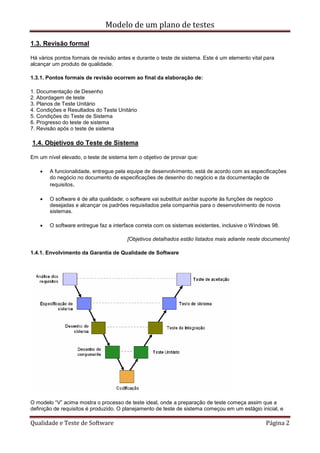 Este documento apresenta um modelo de plano de testes para um novo sistema. Ele descreve o escopo e objetivos dos testes, incluindo testes funcionais, de integração e de aceitação. Além disso, define os critérios de entrada e saída para o teste do sistema, como a correção de erros de alta prioridade e a conclusão de testes de integração e aceitação com sucesso.