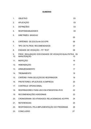 1. O documento estabelece as diretrizes para a implementação de um Programa de Proteção Respiratória (PPR) na empresa, incluindo a seleção, uso, manutenção e treinamento sobre equipamentos de proteção respiratória.